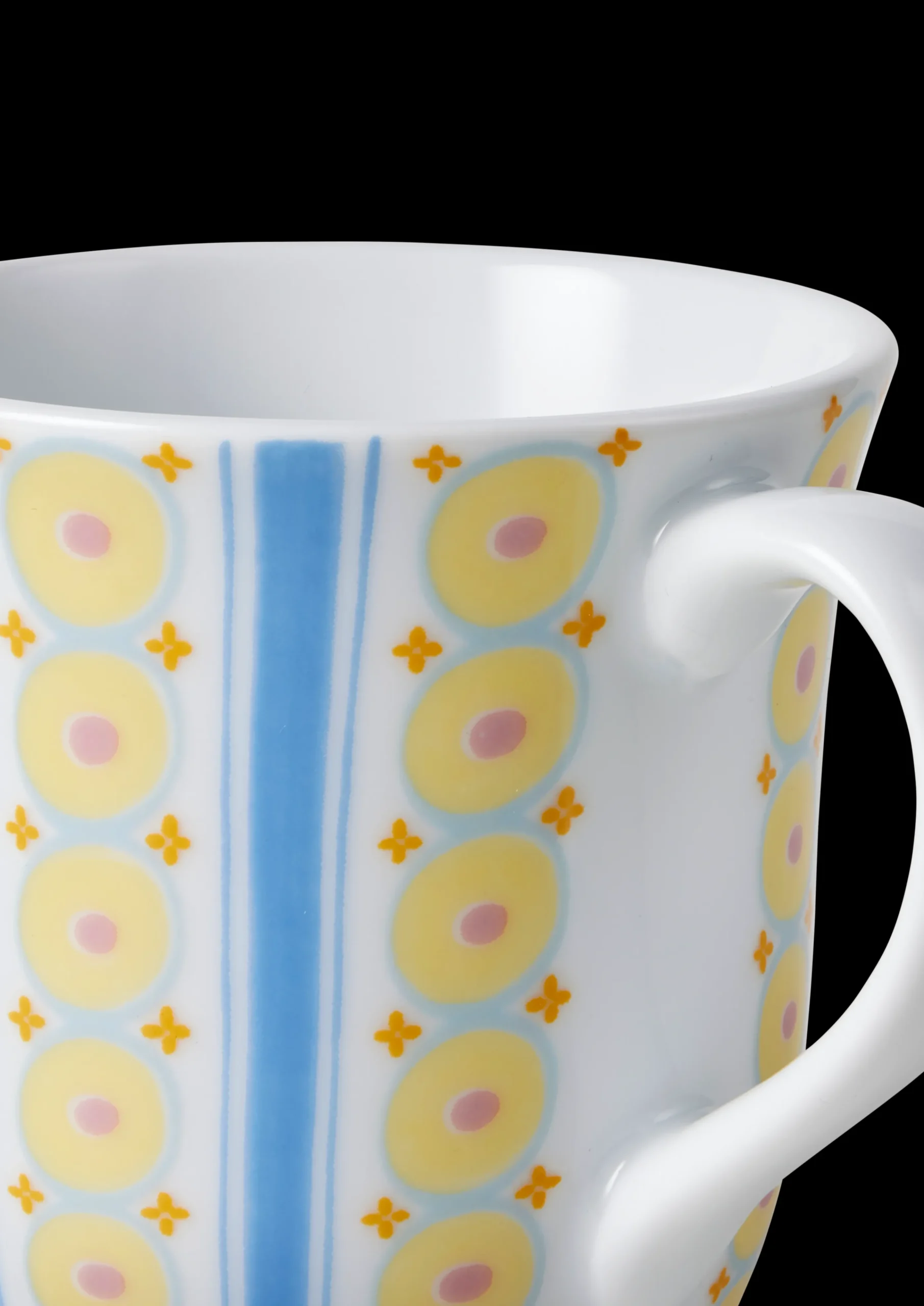 Bjørn Wiinblads stil er alt annet enn minimalistisk. Den er overdådig, særpreget og vidunderlig – og i høy grad definert av livlige farger og en unik stil. Du finner også mange av hans særpregede og kunstneriske dekorasjoner på Eva-krusene fra Bjørn Wiinblad. Designen er et virvar av farger og geometriske former med et håndtegnet preg, som på en eller annen måte passer perfekt sammen. Krusene i blå nyanser har virvlende striper hele veien rundt, innrammet av vertikale blå striper og oransje prikker. Mønsteret er inspirert av Eva-vasens ulike kjoler, og fargene holdes i de samme delikate nyansene som kjennetegner Evas glade og vennlige univers. Kruset rommer 35 cl – perfekt til en god kopp kaffe eller te. Det kan selvfølgelig vaskes i oppvaskmaskin. Du har sikkert andre ting å bruke tiden din på enn å vaske opp for hånd. Hvert krus har sin egen personlighet og fargepalett, men har likevel et tydelig slektskap takket være Bjørn Wiinblads gjenkjennelige strek. Eva-kruset bringer glede til bordet og hyllen, der det tilfører litt mer lys og farge til dagen din – akkurat slik Bjørn Wiinblad elsket det.