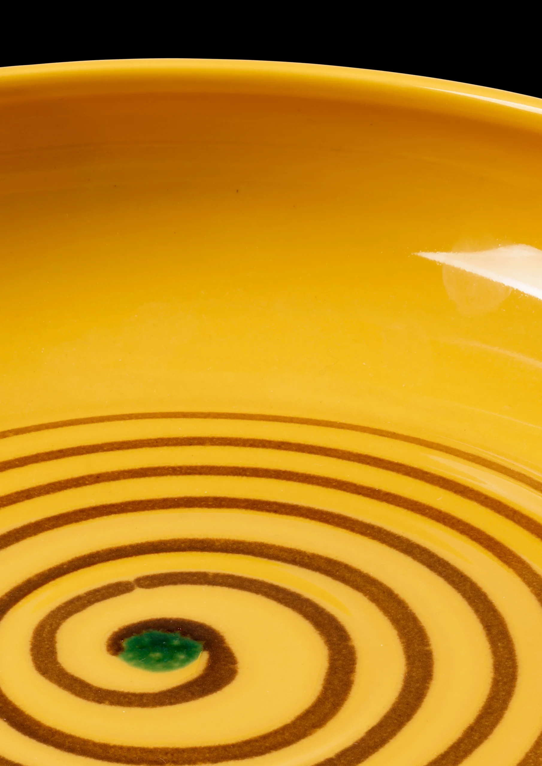 Colore-serien gjentolker håndverket og dekorasjonsteknikkene som har blitt utviklet gjennom flere tiår i Kählers gamle keramikkverksted, på en vakker måte. Serien har sjel og mange sjarmerende detaljer fulle av liv og atmosfære. Midtpunktet i serien er det store, gule keramikkfatet, som skiller seg ut fra de andre delene i serien ved at det har en håndmalt spiral inni, som gjenspeiler de runde formene på rillene som pryder utsiden av fatet. Ettersom spiralen er håndmalt, kan uttrykket variere. Den gule glasuren (safrangul) er inspirert av den blanke urangule glasuren som Kähler brukte på 1830-tallet. Colore har fått en oppdatert gul glasur, som skaper en levende overflate som på en elegant måte fremhever seriens sensuelle detaljer og former. Det store fatet er perfekt for store salater som skal deles – eller bare som et dekorativt og iøynefallende element i hjemmet. Keramikkfatet har 2 års bruddgaranti.