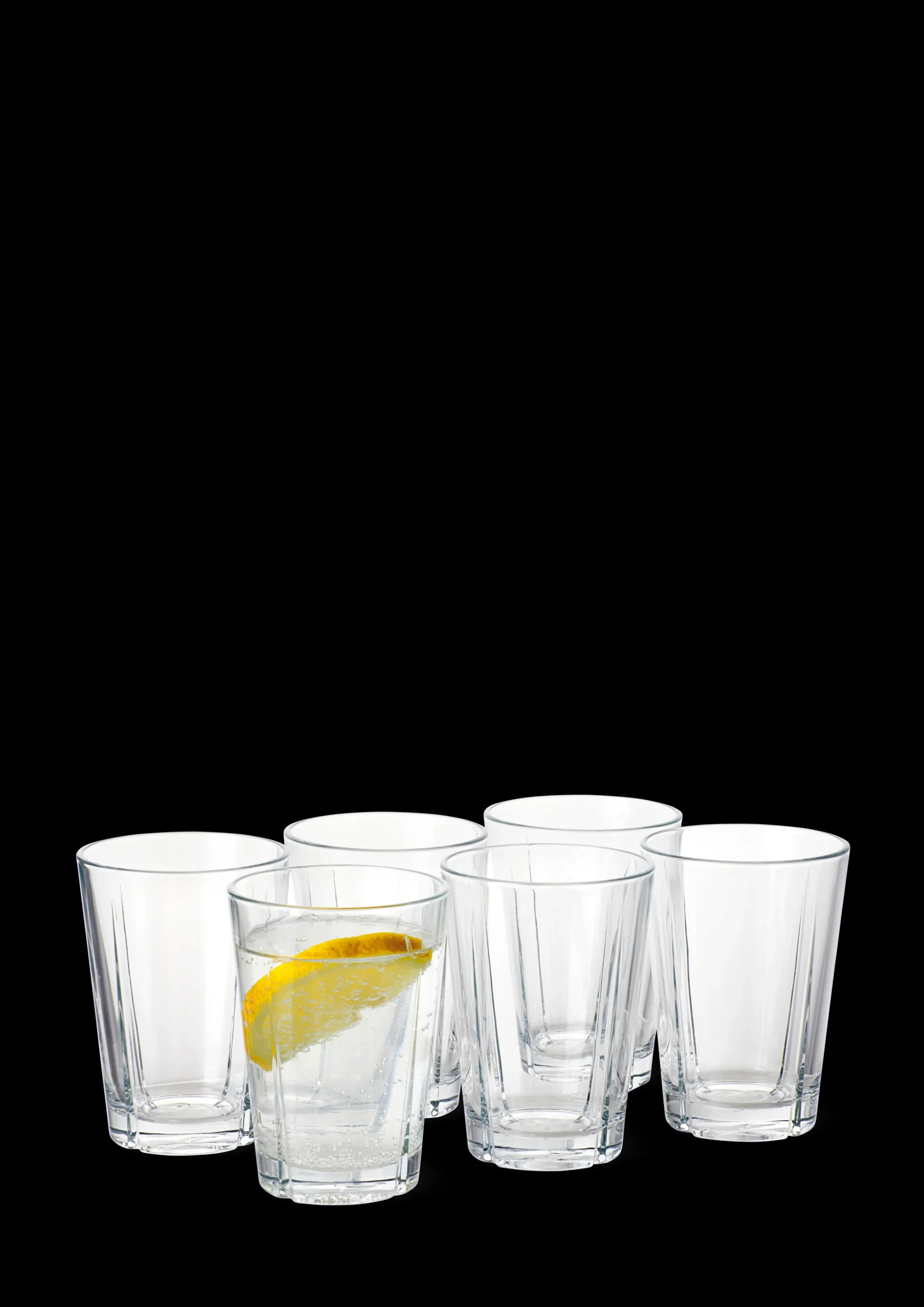 Disse vannglassene er blitt veldig populære. Ikke minst på grunn av den enkle designen, størrelsen og grepet. De er robuste og lette å stable i skapet. Bruk dem også til servering av mindre forretter og små salater. De rene linjene i designen gjør drikkeglassene brukbare med mange forskjellige serviser og bestikksett.