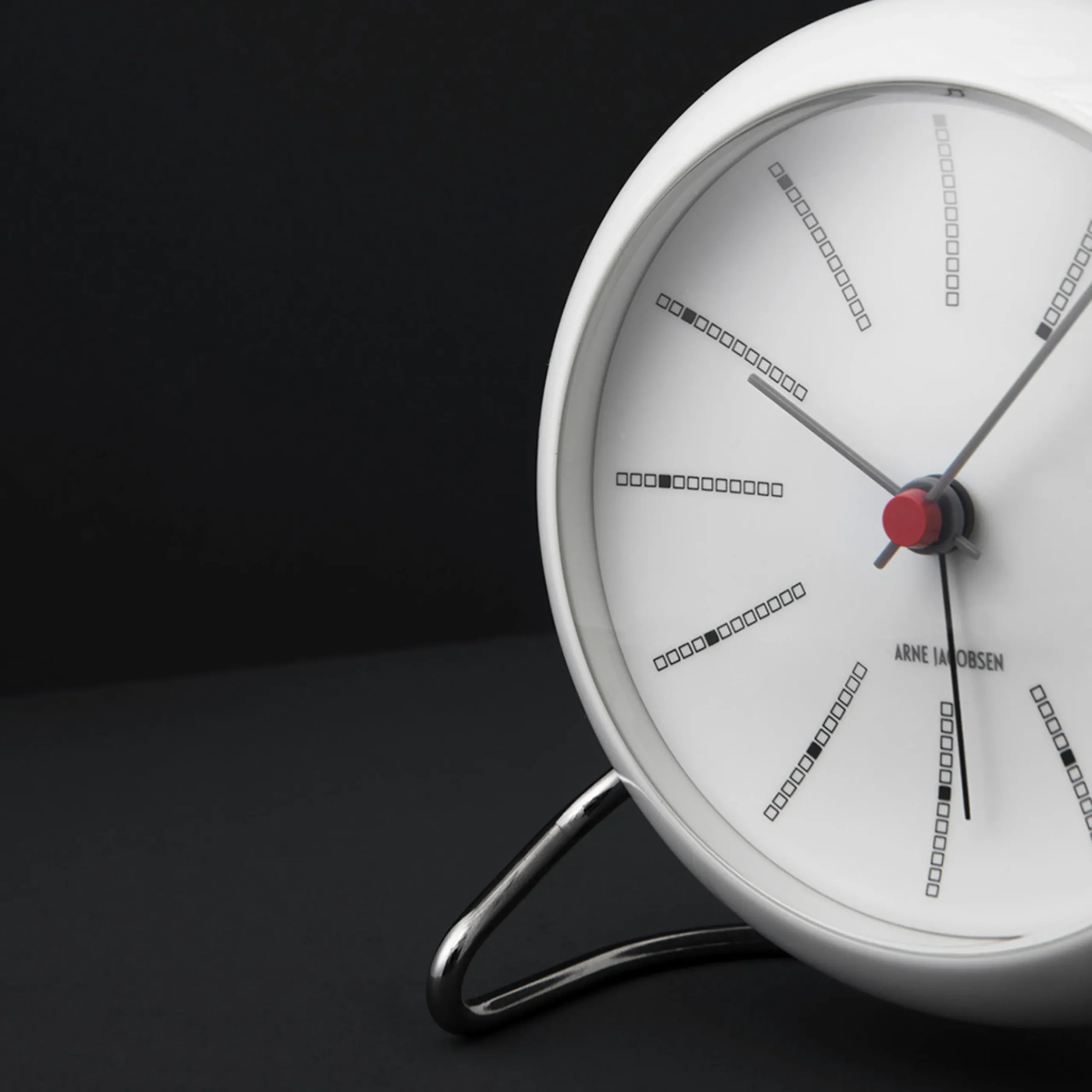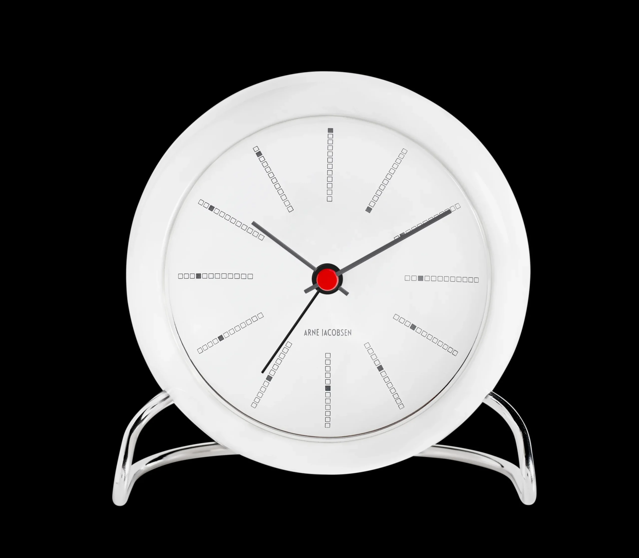 Den verdenskjente arkitektens bordklokke med alarm er skapt i 1939. Det grafiske uttrykket og metallfoten med tydelig inspirasjon fra Myren og Syverstolen gjør klokken til en opplagt gaveide til designelskere. Klokken passer inn overalt i den moderne boligen, og med de oppdaterte funksjonene som snooze og lyssensor er det en effektiv vekkeklokke på nattbordet.