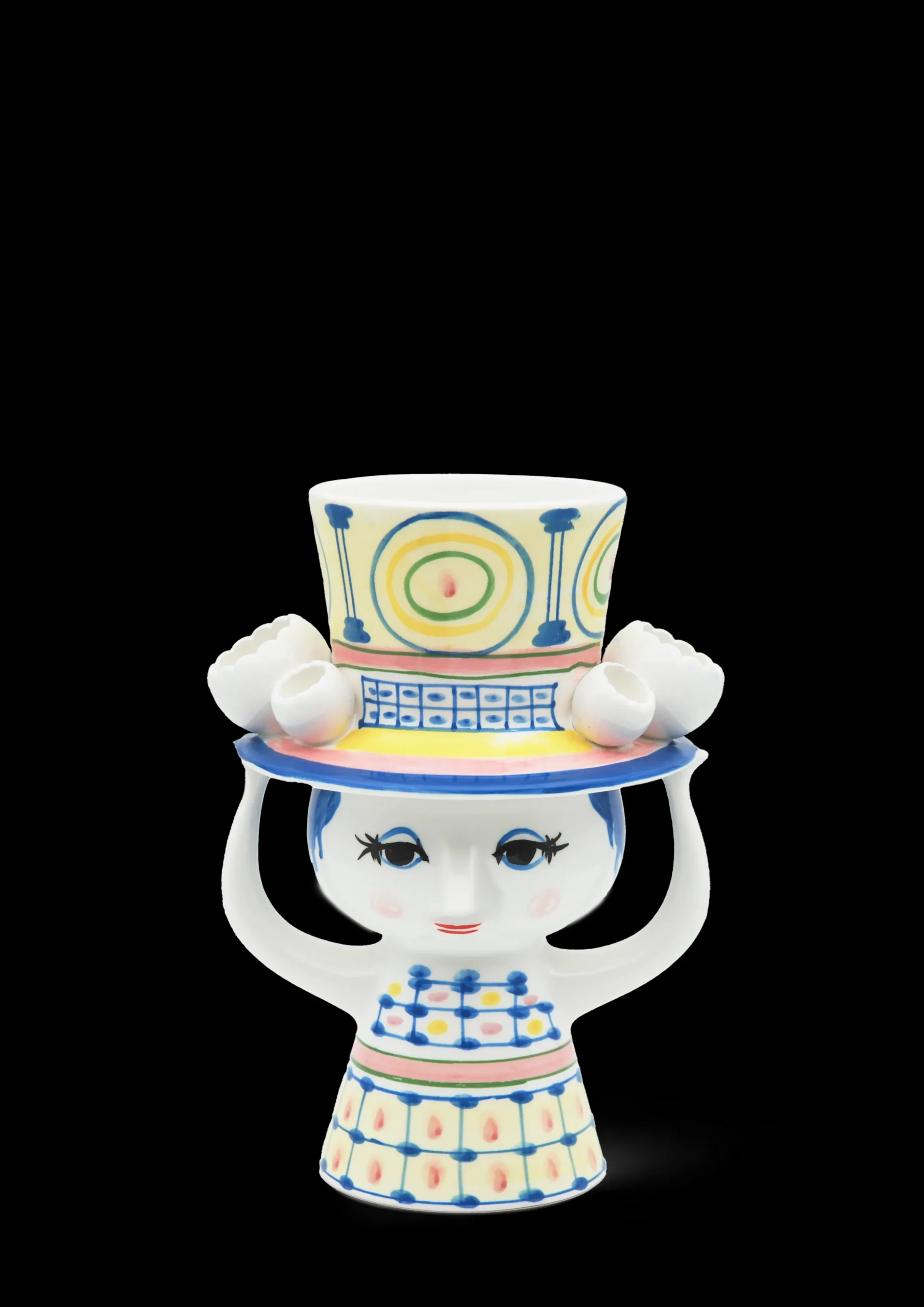 Inviter den nye hattedamen inn og la henne skape glede i boligen med sine fine farger, finurlige detaljer og håndmalte dekorasjoner. Bjørn Wiinblad hadde en forkjærlighet for figurer med hatt, og arkivene rommer utallige eksempler på hvordan hatten dukker opp igjen på stadig nye, kreative og lekne måter. Han designet selvfølgelig ikke små, fine pyntehatter. Nei, det var store, voluminøse kreasjoner som var både skulpturelle og nyskapende i uttrykket – akkurat som i serien Lady with hat. Vasen i blankglasert keramikk på 20,5 cm er preget av den blå fargen, og skjørtets rette linjer står i flott kontrast til hattens sirkulære former. Som et lite tårn vokser hatten opp mot himmelen, mens den fine damen balanserer hatten med hendene sine. Det gir vasen et finurlig og fantasifullt uttrykk, perfekt til blomsterbuketten i den lekne boliginnredningen. En annen detalj som går igjen i serien, er de små, figurative blomstene som er plassert langs skyggen på hattene. Enda en dekorativ detalj inspirert av Bjørn Wiinblads originale former og farger. Akkurat som Bjørn Wiinblad representerer Lady with hat alt som er tullete, skjevt, kreativt og vidunderlig.