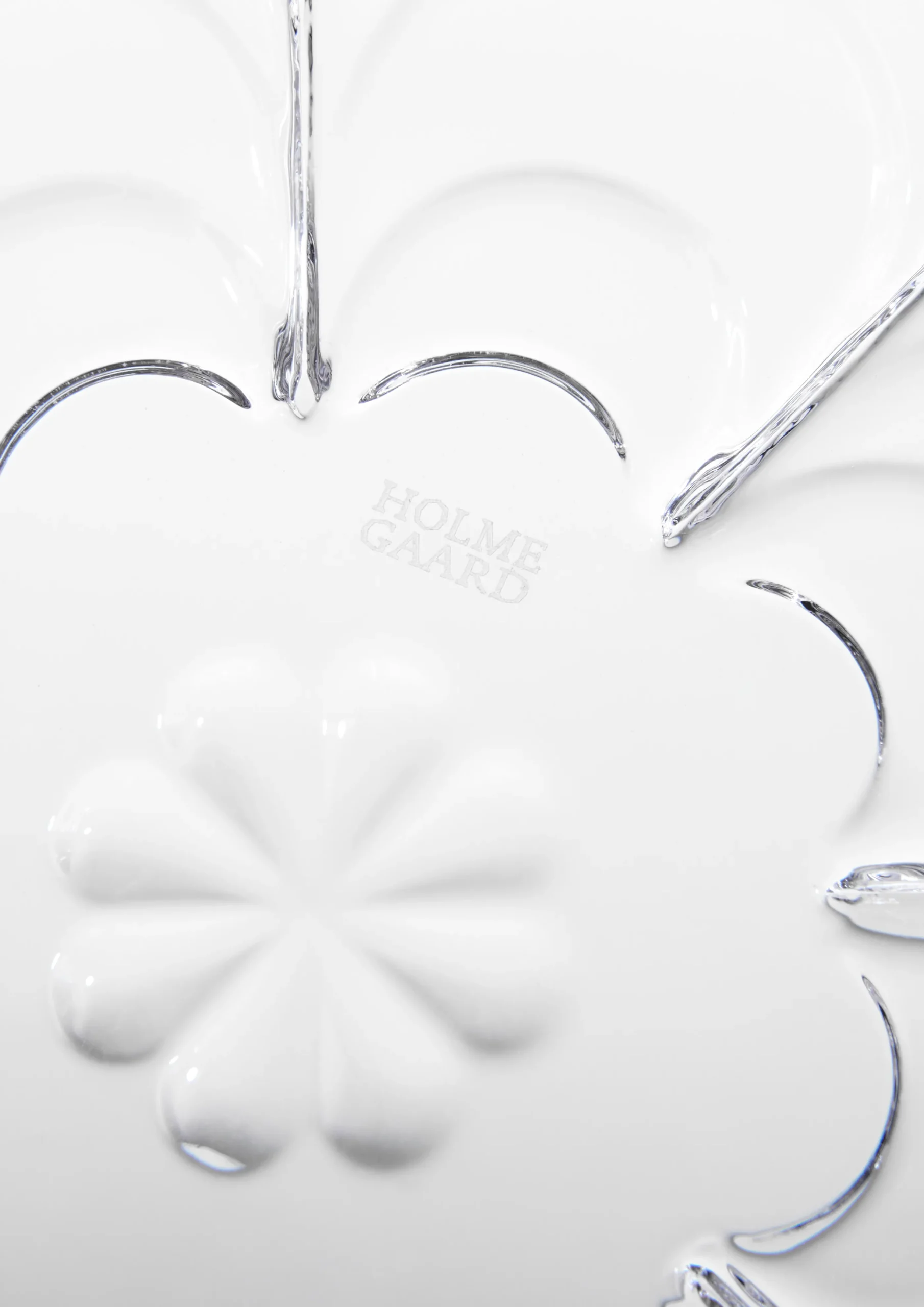Holmegaards Lily-serie er inspirert av de forskjellige stadiene i vannliljens blomstring og har det samme lette og poetiske uttrykket som den vakre blomsten selv. Desserttallerkenen i klart glass har en diameter på 16 cm og leveres i 2-pakning – perfekt til servering av desserter, iskrem og kake. Blomstermønsteret stikker ut som relieff i det støpte glasset, som er både gjennomsiktig og taktilt. Linjene i designen er enkle, myke og organiske, men på en strømlinjeformet og stilfull måte som skaper en fin balanse mellom et romantisk og moderne uttrykk. Desserttallerkenene er enkle å stable og kan vaskes i oppvaskmaskin, så du kan bruke dem daglig uten å måtte bekymre deg for å vaske dem for hånd. Serien inneholder også en stor serveringsskål, en mindre skål og vannglass – alle i fire forskjellige farger. Alle delene i Lily-serien er laget av farget glass, slik at fargen holder seg vakker over tid.