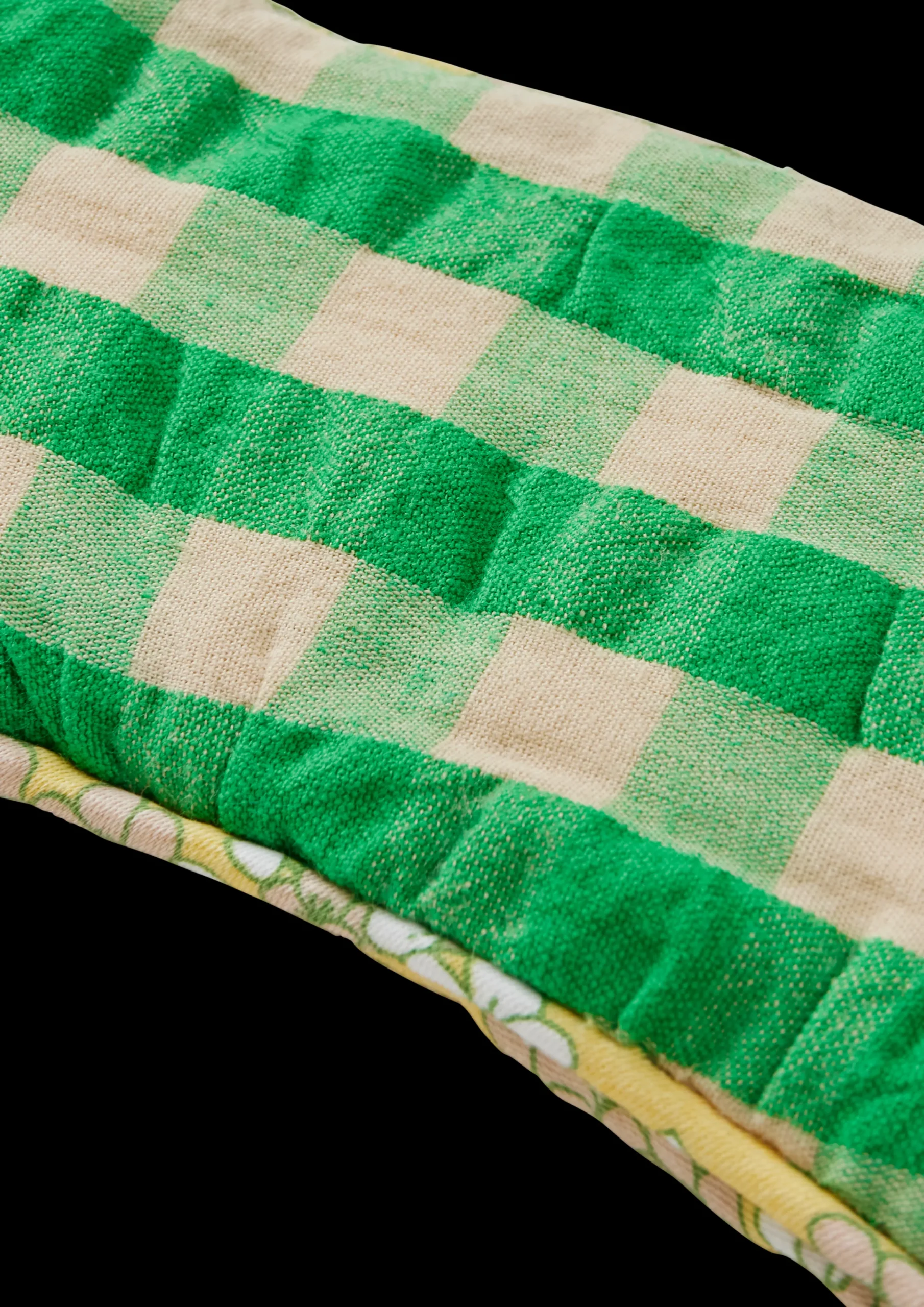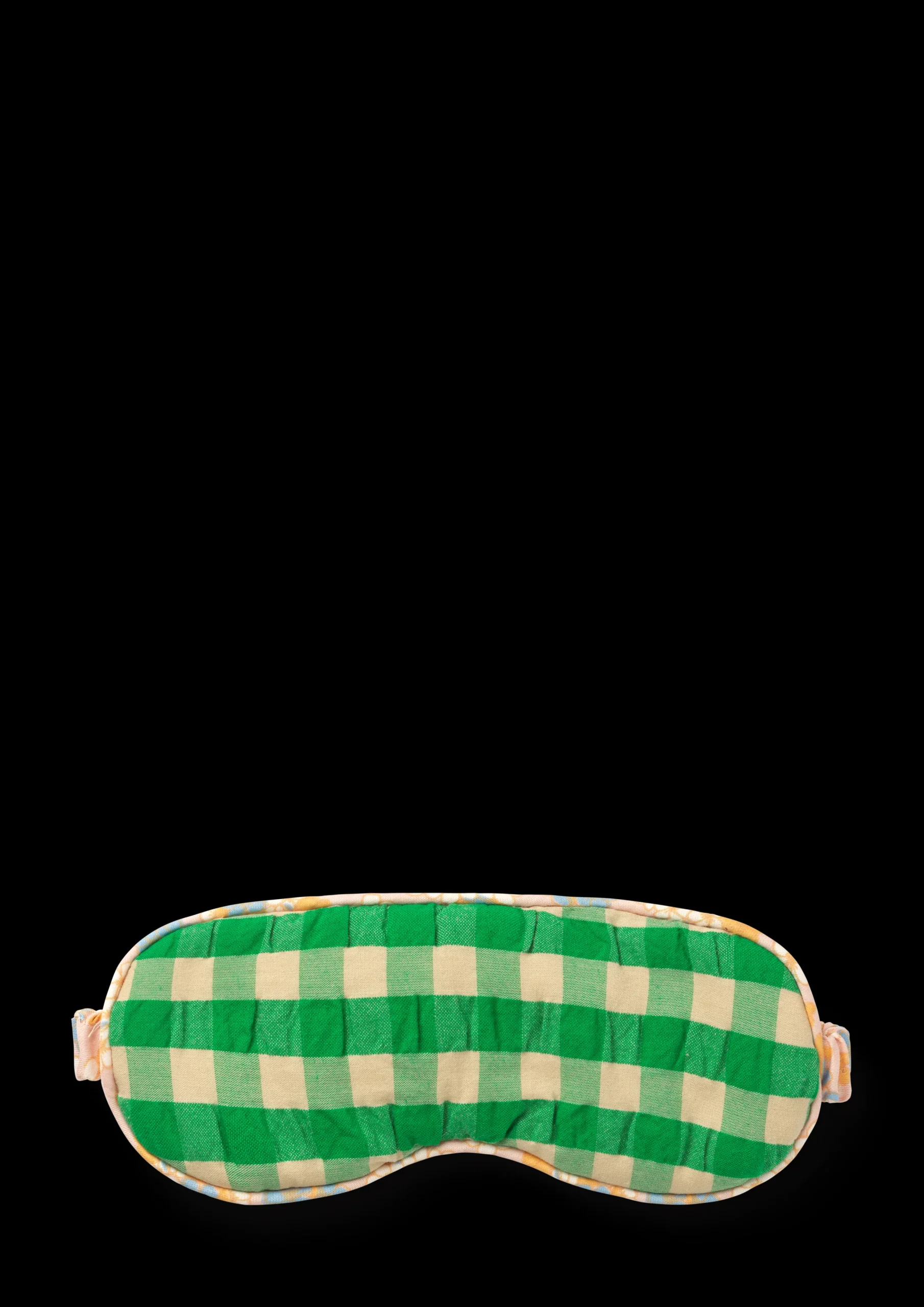 JUNA handler om gleden ved å omgi seg med tekstiler som gjør livet vakrere, mykere, mer fargerikt og morsommere – også når du sover. Og med Dodo fra JUNA får du en stilren og praktisk sovemaske i Bæku0026Bølge-stoff i en grønn/sandfarget kombinasjon på den ene siden og Pleasantly-stoff med gul bunn på den andre. Dodo-sovemasken er laget av 100 % økologisk bomull, og den deilige, myke vatteringen er perfekt for en god natts søvn med uendelige drømmer. Samtidig sørger den behagelige, stofftrukne elastikken for at sovemasken er skånsom mot håret og alltid holder seg på plass. Kombinasjonen av rutete Bæku0026Bølge-stoff og blomstret Pleasantly-stoff skaper en herlig blanding av mønstre hvor fargene koordineres slik at fargene på de to sidene utfyller hverandre på en flott måte. Det er helt opp til deg og humøret ditt hvilken side du vil vende utover. Som en del av JUNAs ansvarlige designfilosofi er sovemasken laget av overskuddsstoff fra produksjonen av JUNA-sengetøy.