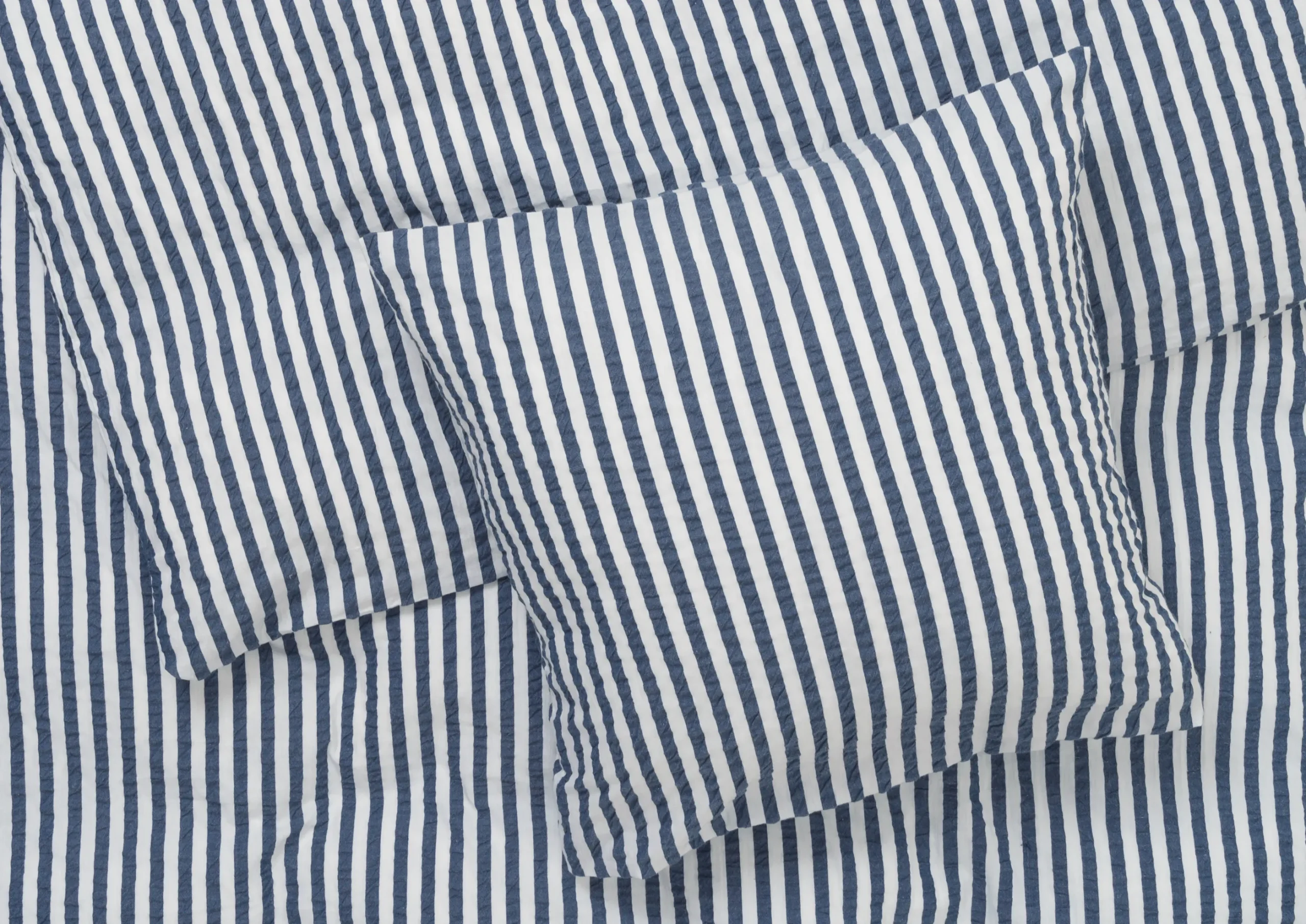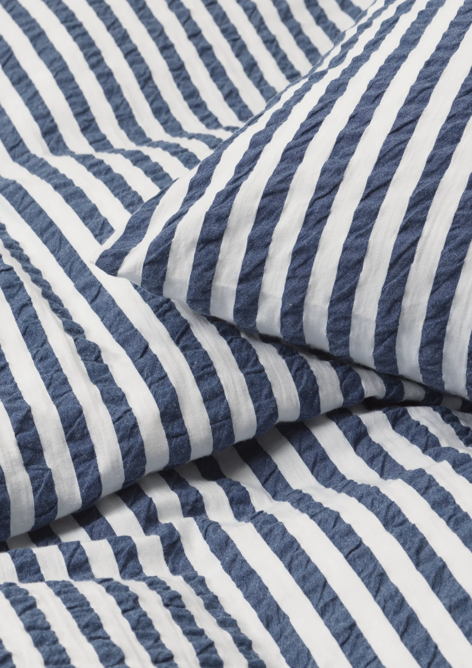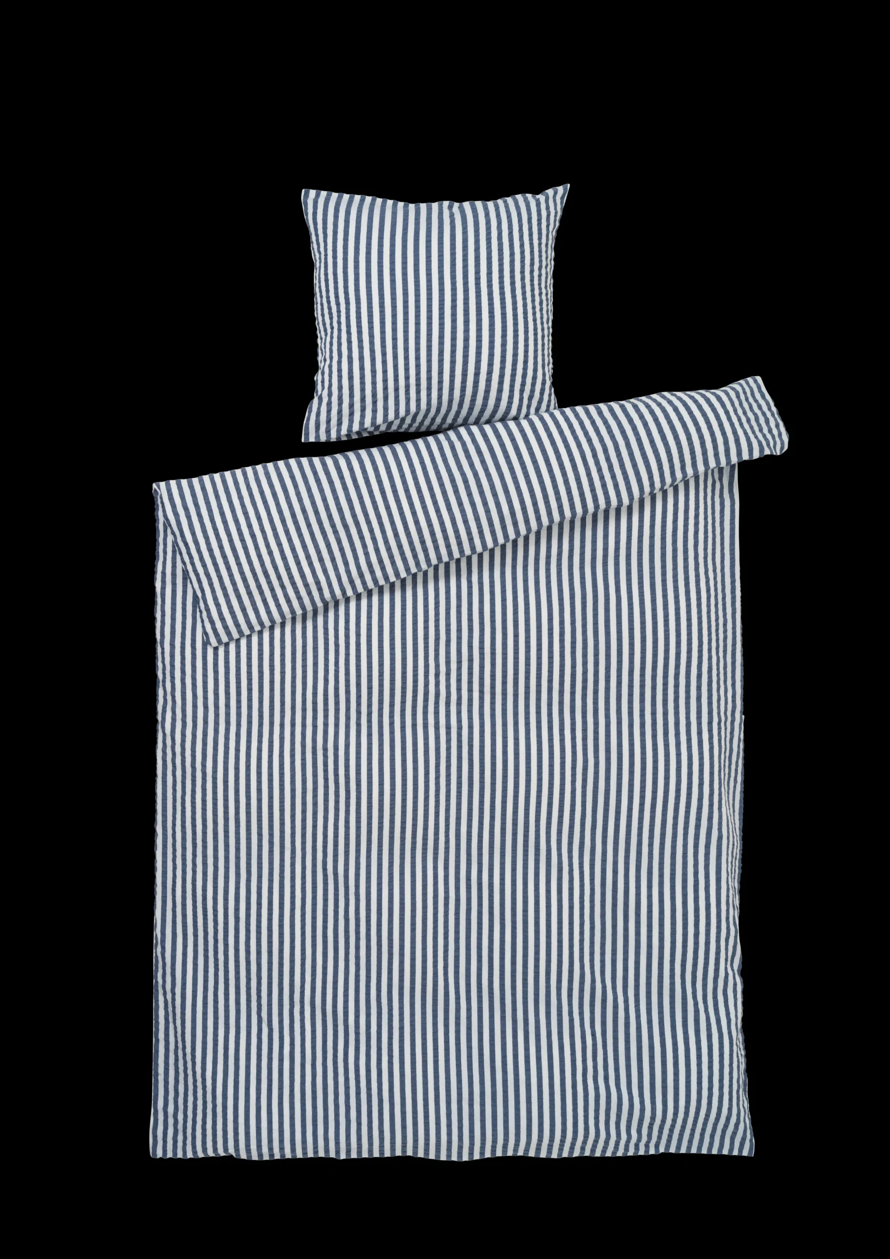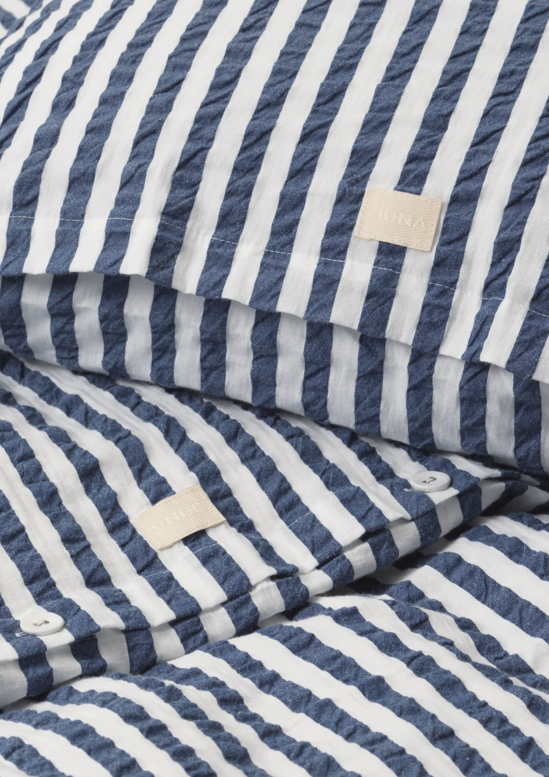 Du tilbringer mange timer i sengen hver natt, og det betyr noe hvilke stoffer du omgir deg med. Juna-sengetøyet er laget for å være sanselig og komfortabelt, er 100 % økologisk og lar deg sovne trygt og komfortabelt hver natt og få en god natts søvn. Juna handler om å nyte livet og gleden av et sengetøy som gjør livet vakrere, mykere, mer fargerikt og morsommere. Derfor er mønster og farger en stor del av Juna, og gir sengetøyet en koselig og avslappet følelse. Den velkjente og klassiske stripete vevingen tolkes i en moderne fargepalett, og det er denne kombinasjonen av den nostalgiske og moderne følelsen som bidrar til å skape en unik og glad Juna-atmosfære på soverommet. Stripete Bæk u0026 Bølge i mørkeblått/hvitt har vakre sommerfarger som minner om stripete vintage fluktstoler og parasoller. Materialet er 100 % økologisk bomull som er både OEKO-TEX®-merket og GOTS-sertifisert. Putevaret har konvoluttlukking, og dynetrekket lukkes med knapper. Hvis du har et annet Juna-sengetøy hjemme, kan du mikse og matche ulike farger og mønstre og skape din egen personlige og lekne stil på soverommet. Takket være vevemåten, har Bæk u0026 Bølge en seersucker-struktur som lar luften sirkulere mellom huden og dynen – perfekt for varme sommernetter. Luftstrømmen bidrar til å gi deg en god natts søvn og til at du våkner uthvilt neste dag, klar for en ny dag. I tillegg er det ikke nødvendig å stryke sengetøy laget av seersucker, så du kan la den varme sommerbrisen tørke det og legge det på sengen rett fra klessnoren