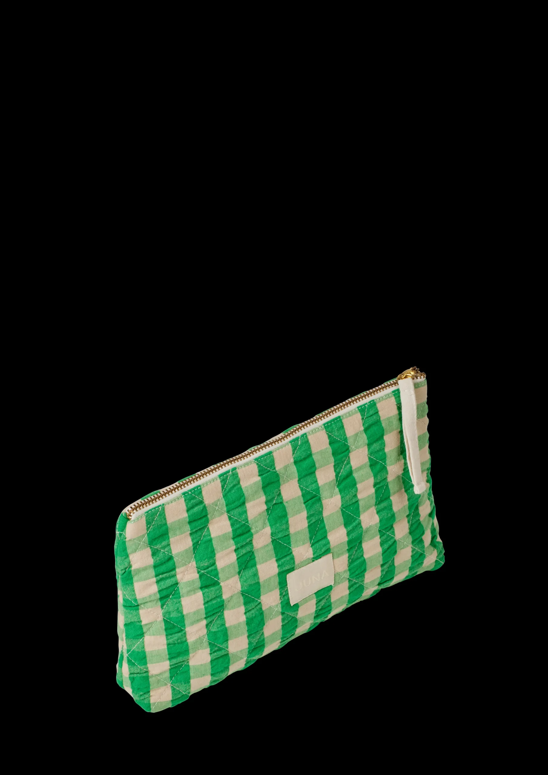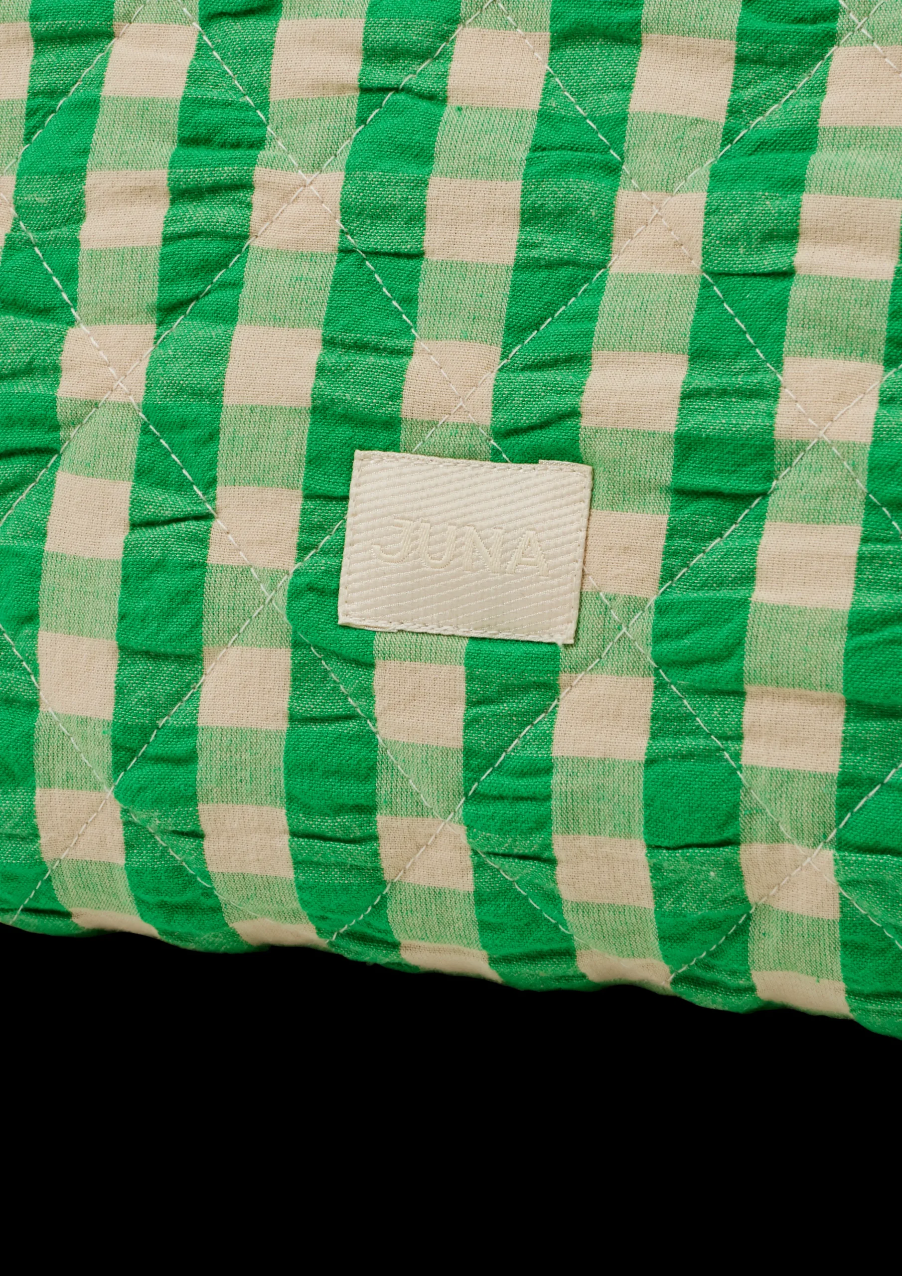 JUNA handler om gleden ved å omgi seg med tekstiler som gjør livet vakrere, mykere, mer fargerikt og morsommere. Og med sminkevesken Bæku0026Bølge Nola fra JUNA får du en stilren og praktisk quiltet veske som rommer alt fra rouge til maskara og som også er enkel å ta med seg når du er på farten. Den romslige sminkevesken måler 23 x 15 x 5 cm og kan også brukes til reisedokumenter, skrivesaker eller andre småting som du vil ha pent organisert i håndvesken eller hjemme. Nola-sminkevesken er laget av 100 % økologisk Bæku0026Bølge -bomullsstoff i den svært populære fargekombinasjonen grønn/sand. Og som en del av JUNAs ansvarlige designfilosofi er sminkevesken produsert av overskuddsstoff fra produksjonen av JUNA-sengetøy. Den kan vaskes i maskin på opptil 40 grader, noe som ikke bare er skånsomt for miljøet, men også for bomullsstoffet, som får lengre levetid når det vaskes på lavere temperatur.