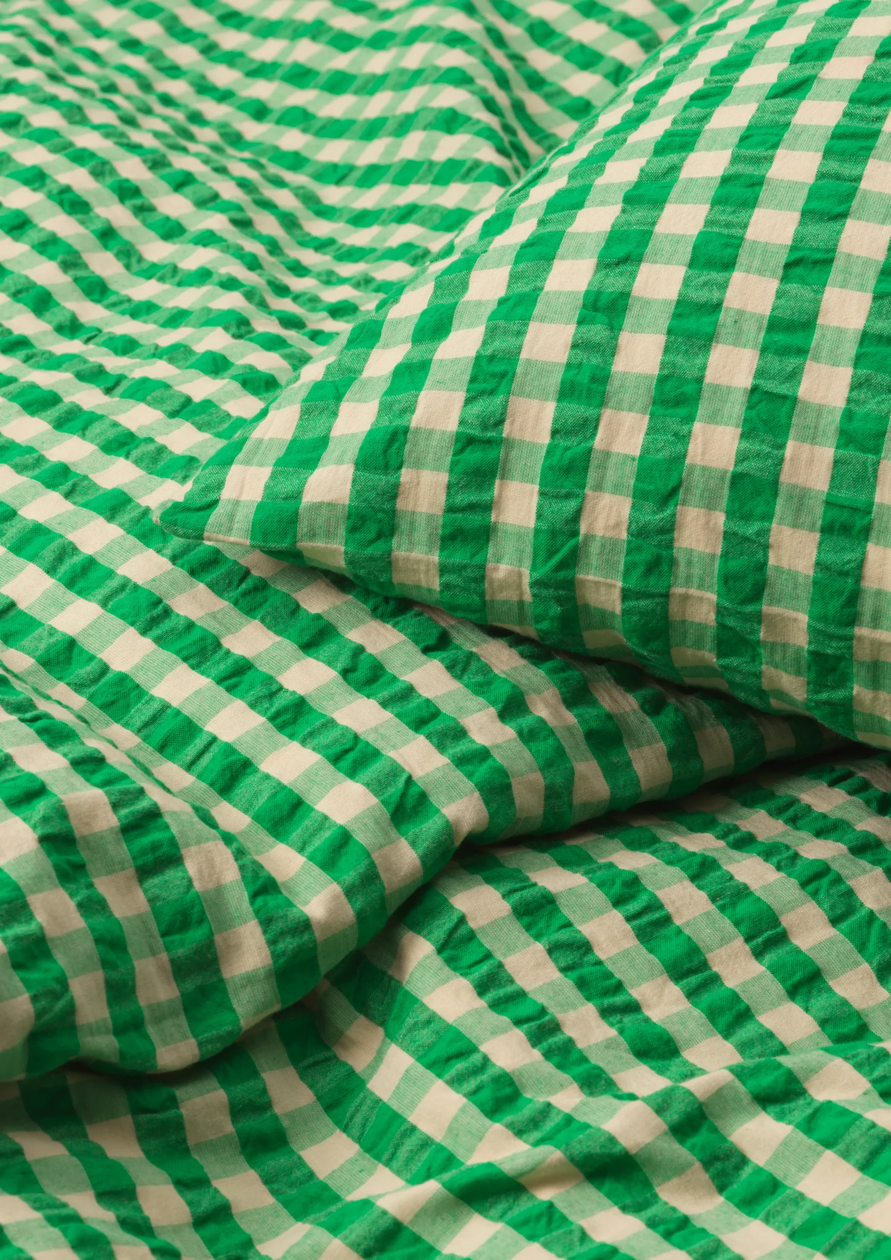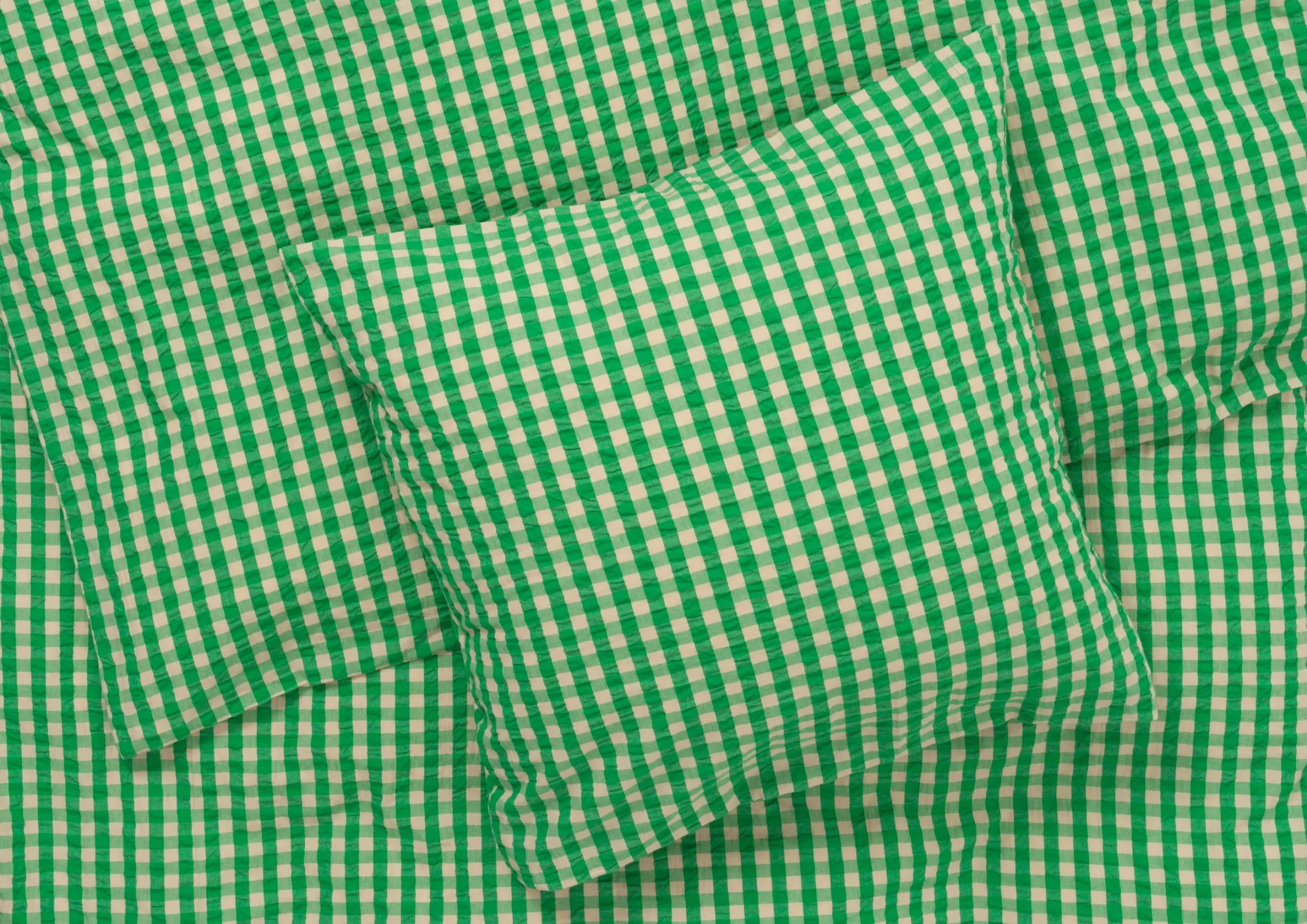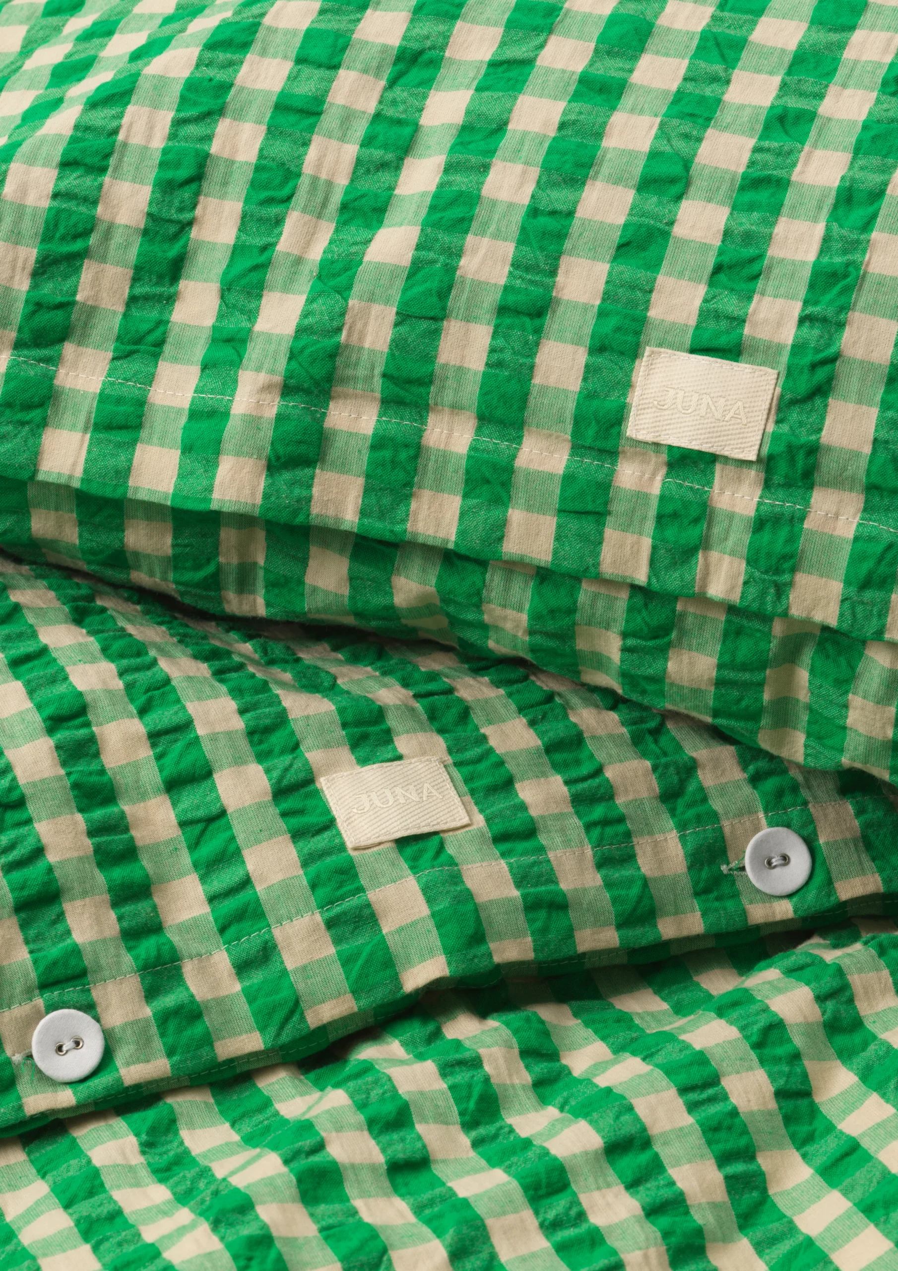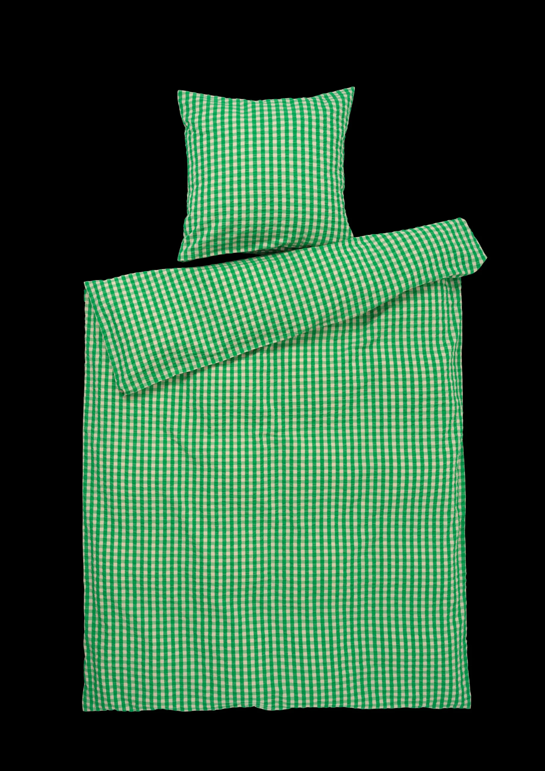 Du tilbringer mange timer i sengen hver natt, og det betyr noe hvilke stoffer du omgir deg med. Juna-sengetøyet er laget for å være sanselig og komfortabelt, er 100 % økologisk og lar deg sovne trygt og komfortabelt hver natt og få en god natts søvn. Juna handler om å nyte livet og gleden av et sengetøy som gjør livet vakrere, mykere, mer fargerikt og morsommere. Derfor er mønster og farger en stor del av Juna, og gir sengetøyet en koselig og avslappet følelse. Den velkjente og klassiske rutete vevingen tolkes i en moderne fargepalett, og det er denne kombinasjonen av den nostalgiske og moderne følelsen som bidrar til å skape en unik og glad atmosfære på soverommet med Juna. Det rutete Bæk u0026 Bølge i fargene grønt/sand gir en herlig sprø og frisk følelse – nesten som de første delikate bladene på trærne om våren. Materialet er 100 % økologisk bomull som er både OEKO-TEX®-merket og GOTS-sertifisert. Putevaret har konvoluttlukking, og dynetrekket lukkes med knapper. Hvis du har et annet Juna-sengetøy hjemme, kan du mikse og matche ulike farger og mønstre og skape din egen personlige og lekne stil på soverommet. Takket være vevemåten, har Bæk u0026 Bølge en seersucker-struktur som lar luften sirkulere mellom huden og dynen – perfekt for varme sommernetter. Luftstrømmen bidrar til å gi deg en god natts søvn og til at du våkner uthvilt neste dag, klar for en ny dag. I tillegg er det ikke nødvendig å stryke sengetøy laget av seersucker, så du kan la den varme sommerbrisen tørke det og legge det på sengen rett fra klessnoren. Sengesettet består av et dynetrekk på 140 x 200 cm og et putevar på 60 x 63 cm.