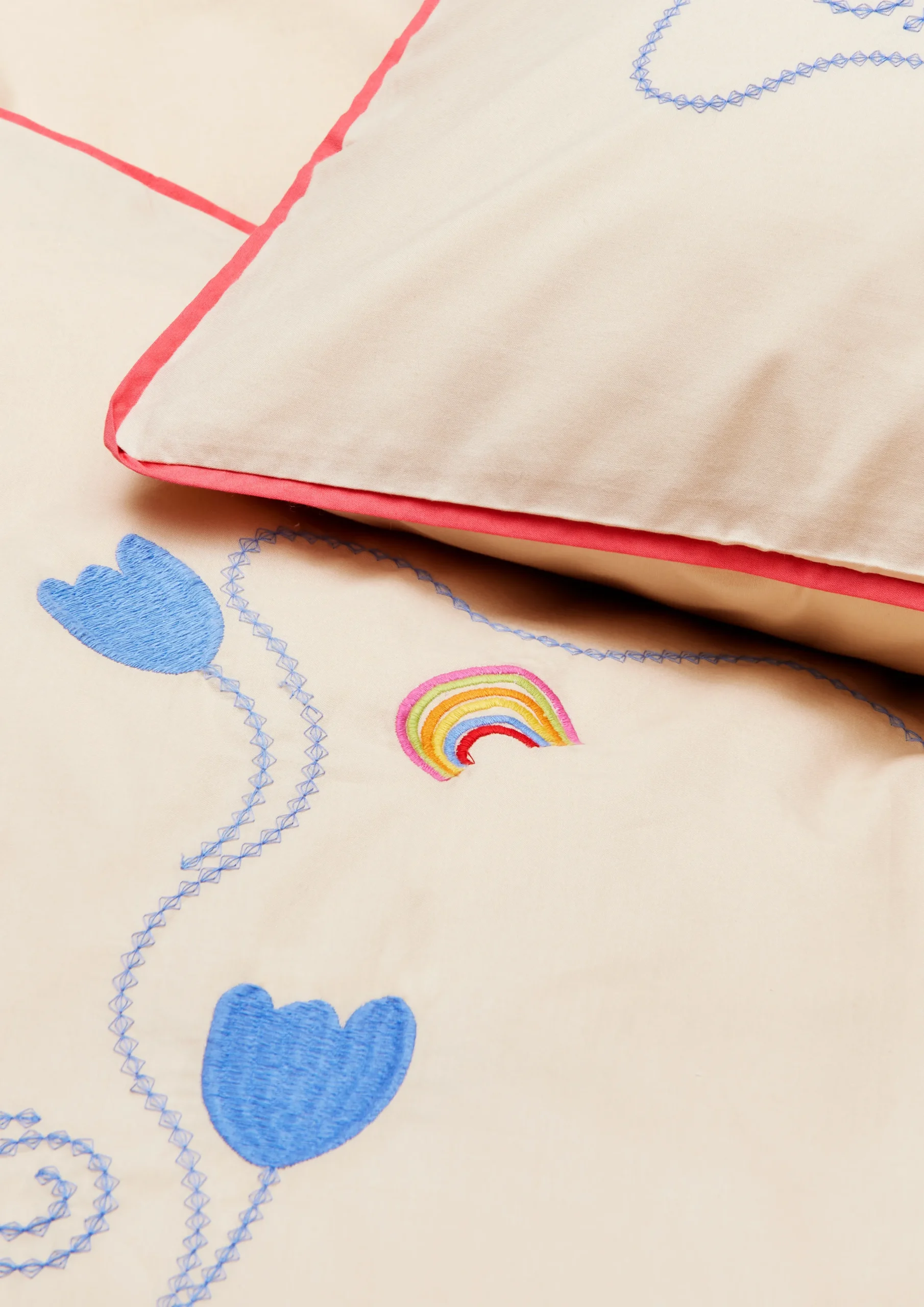 Med designsamarbeidet JUNA X KIMPOP tolker de fargerike personlighetene Sofie Linde og Joakim Ingversen JUNAs drømmende univers i sin fargerike, lekne og unike stil under navnet KIMPOP. Deres første kolleksjon, Lollipop, byr på bølgende kurver, overraskende linjer og moderne fargekombinasjoner som skaper en fargerik og fantasifull stemning på soverommet, i sofaen, i lenestolen, på dagsengen eller der du ellers slapper av i nattøy med dyne og pute. Akkurat som JUNA ønsker Sofie Linde og Joakim Ingversen å skape en hyggelig og uhøytidelig følelse med tekstildesign som inspirerer til store drømmer i fargerike omgivelser. Hele Lollipop-serien er dessuten produsert i 100 % økologisk bomull, og tekstilene er GOTS-sertifisert, noe som betyr at du er sikret en ansvarlig produksjon og tekstiler av høy kvalitet utviklet med omtanke og omsorg for både miljø og mennesker. Sengesettet i fargen sand måler 140 x 200 cm og har en fremtredende rød pyntekant hele veien rundt, som står i vakker kontrast til stoffets dempede sandfarge. I tillegg er både putetrekket og dynetrekket dekorert med broderte detaljer i stil med moderne marmor. En blå blomsterranke bølger som en gammeldags blonde i en ny fortolkning, og dynetrekket er dekorert med en søt regnbue som samler alle farger på tvers av hele JUNA X KIMPOP-kolleksjonen. Alt i en herlig, umiddelbar stil. Og så gjør det jo heller ikke noe at sengetøyet også er OEKO-TEX®-merket, som er din garanti for at sengetøyet ikke er skadelig for helsen din og samtidig også mindre belastende for miljøet. (GOTS «Organic» Certified by Control Union, CU1026087)nu003cbru003eVi anbefaler alltid at du vasker sengetøyet ditt før bruk.