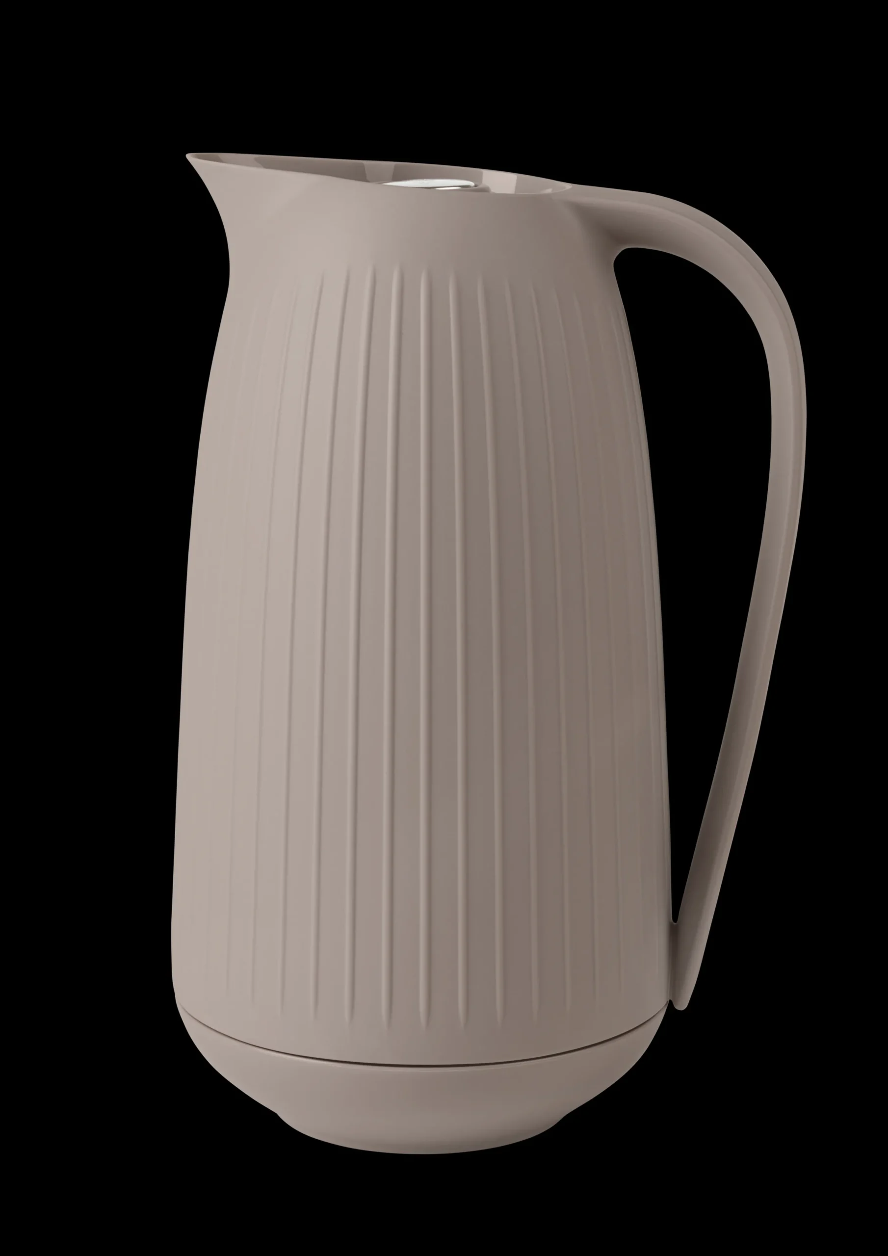 Trenger kaffeserviset ditt en oppdatering til søndagsbrunsjen med familie og venner? Eller vil du bare oppgradere hverdagsserviset med flott design? Den varme grå Hammershøi Thermos-muggen rommer 1 liter og har en fin, matt silkefinish som fremhever de ikoniske Hammershøi-rillene, mens det myke integrerte håndtaket gjør muggen svært behagelig å bruke. Termokannen har en glassinnsats som holder væsken varm. Skrupluggen er tett forseglet, og den innebygde trykknappen i høypolert rustfritt stål gjør det ekstra behagelig å skjenke fra kannen. Bruk den vakre og stilfulle termokannen i varm grå alene eller som en perfekt match til Kähler Hammershøi Summer-serien med forglemmegei eller sommerbær.