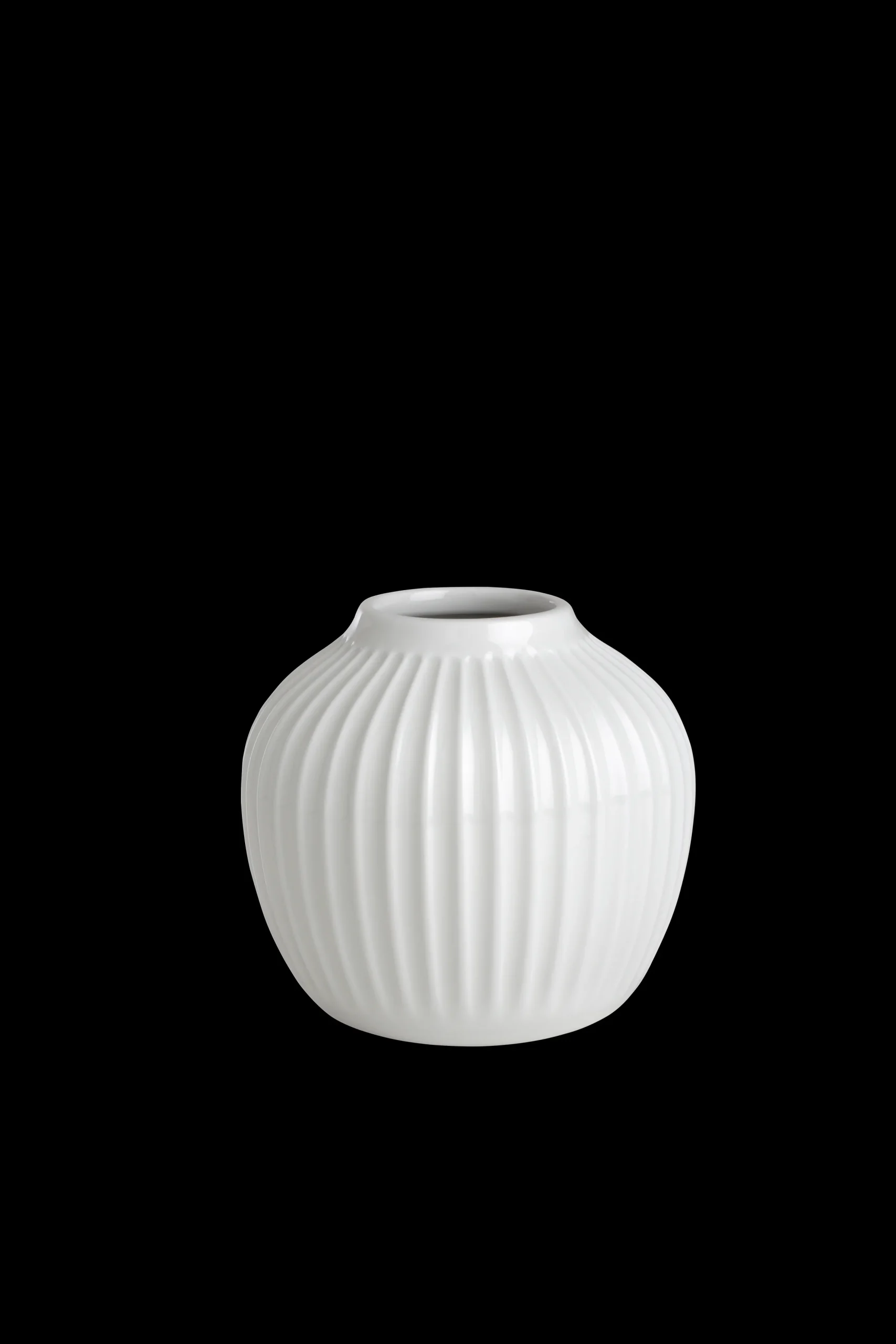Den elegante lille hvite designvasen fra Hammershøi-serien er inspirert av Svend Hammershøis verker, og har et tidløst og moderne formspråk. Designvasen har en fin, liten krage om halsen, som sammen med rillene og vasens harmoniske formspråk naturlig forlenger de friske blomstene slik at de på en elegant måte går i ett med porselenet. Bruk den unike designvasen fra Kähler alene eller i et elegant designtablå.