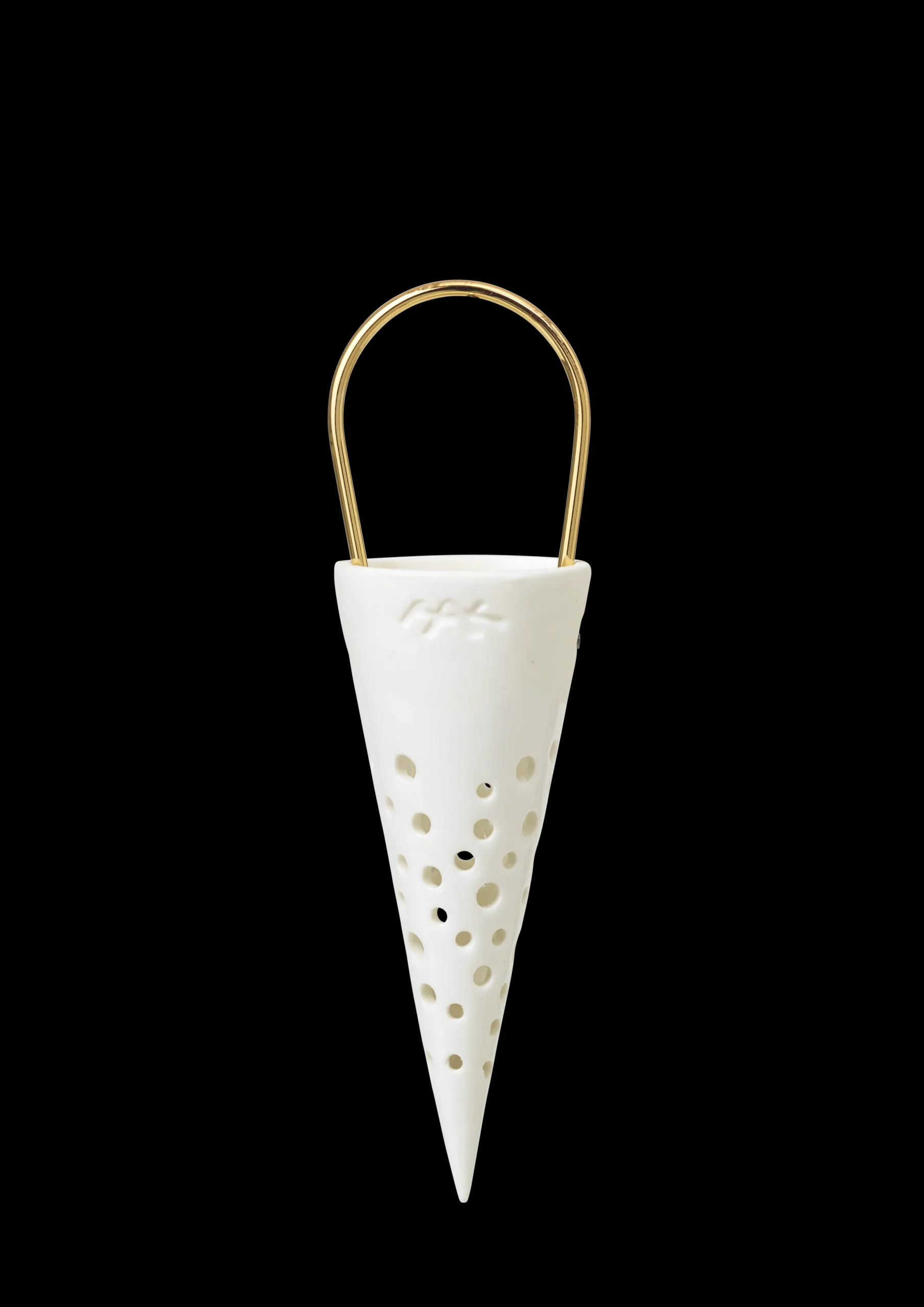 Den vakre Nobili juleserien er som skapt for ekte julestemning på en moderne og elegant måte. I år tilføres serien to størrelser kremmerhus i snehvit og olivengrønn, i henholdsvis H14,5 cm og H18cm. Kremmerhusene er fremstilt i benporselen med en blank olivengrøn eller snehvit glasur m. blank gull metalbøyle og passer perfekt som pynt i alle julehjem. Kremmerhusene er en videreførsel af Nobili juletrær, og har også mange små håndskårete og dekorative hull. Kremmerhusene er til oppheng og dekorasjon. Kremmerhusene hører til på juletreet, og tradisjonelt skal det fylles med godteri, f.eks. peppernøtter eller karameller. Kremmerhuset hører til blant de eldre former for juletrepynt, og henger naturligvis sammen med tanken om å pynte treet med spiselig pynt. Designet av designduoen R7B – Mette Bache og Barbara Bendix Becker