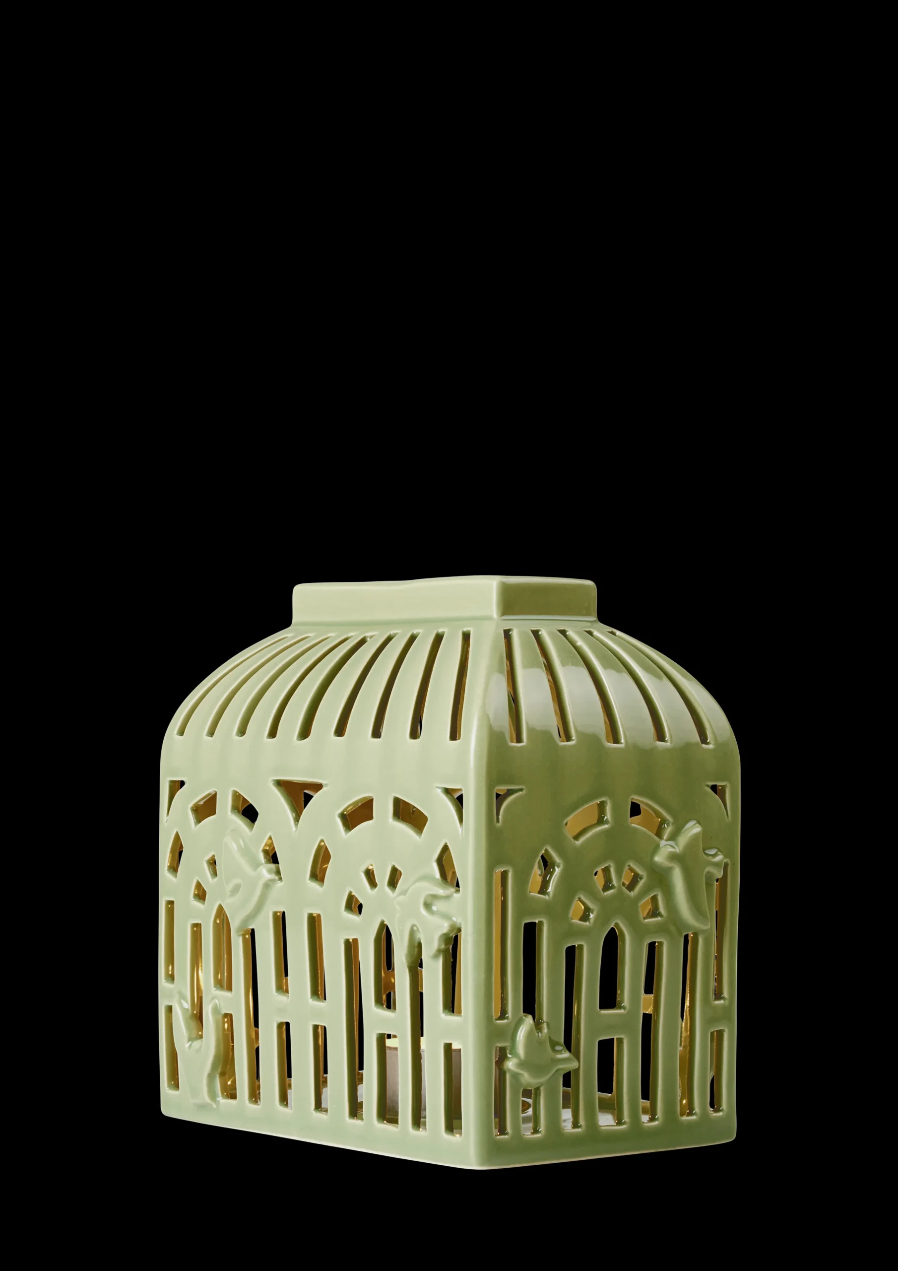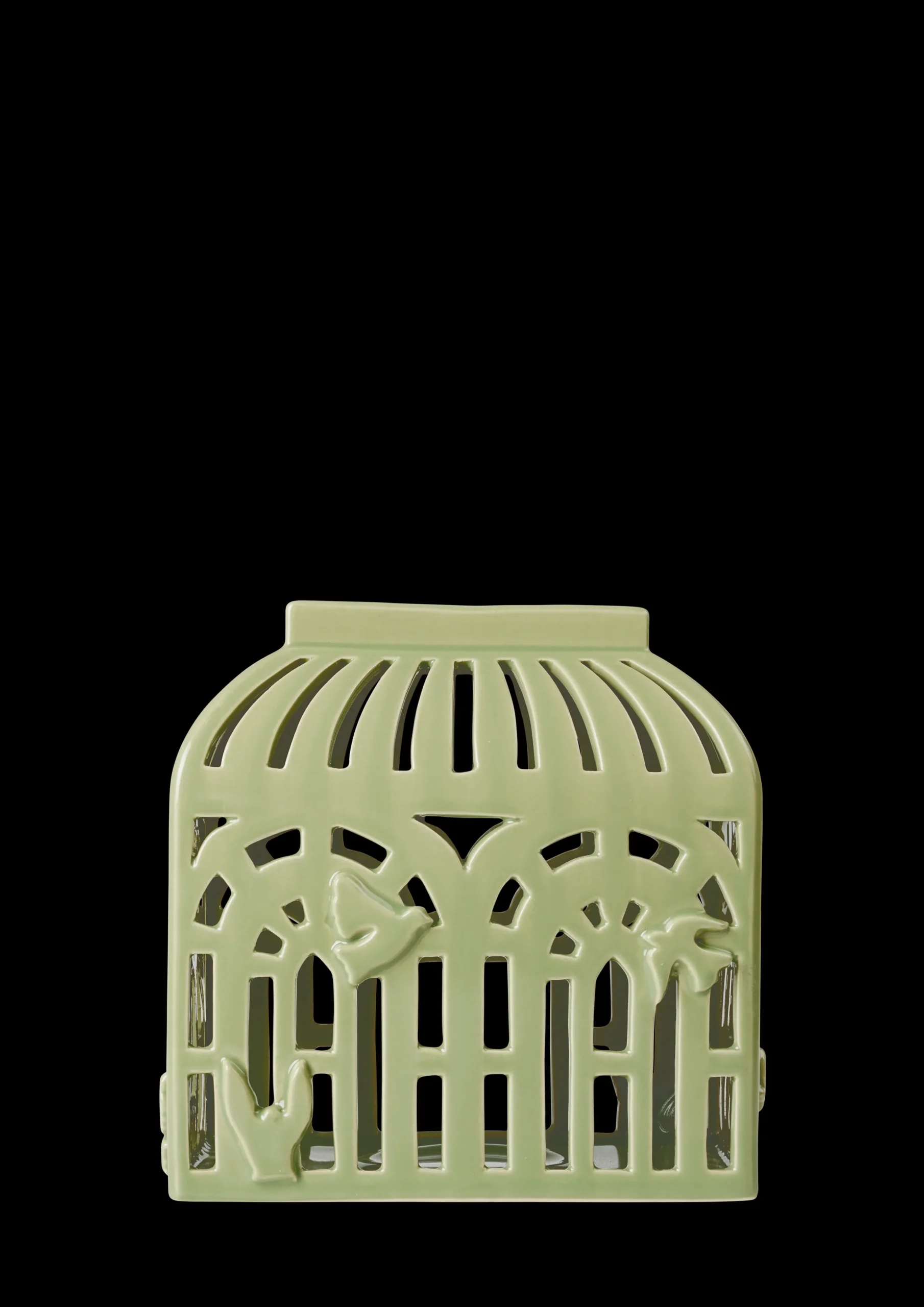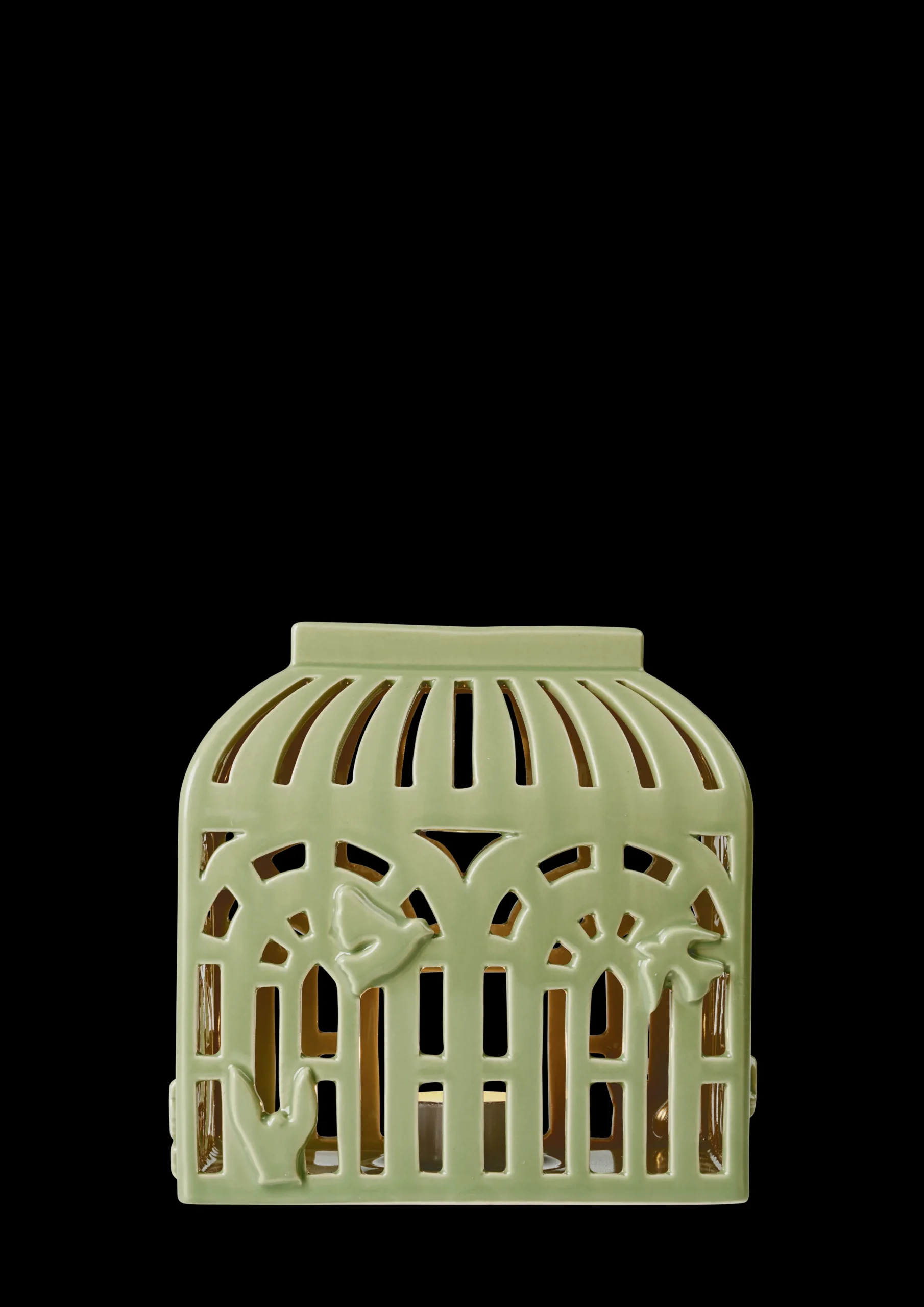 Det delikate lyshuset Orangeri på 16 cm, er laget av keramikk og er glasert i den elegante og naturlige Spring Leaf-grønnfargen. Formet som et gammeldags, romantisk orangeri, kan du tydelig føle arkitekturen, atmosfæren og teksturen. De mange små rutene som utgjør et orangeri er gjengitt som utstansede dekorasjoner i klassiske former. Telysenes glød strømmer gjennom vinduene og skaper en varm og koselig atmosfære. Hvert eneste lille snitt er laget for hånd, akkurat som de stiliserte fuglene i forskjellige former som pryder utsiden. Vakkert keramikkhåndverk fra Kähler på sitt beste.