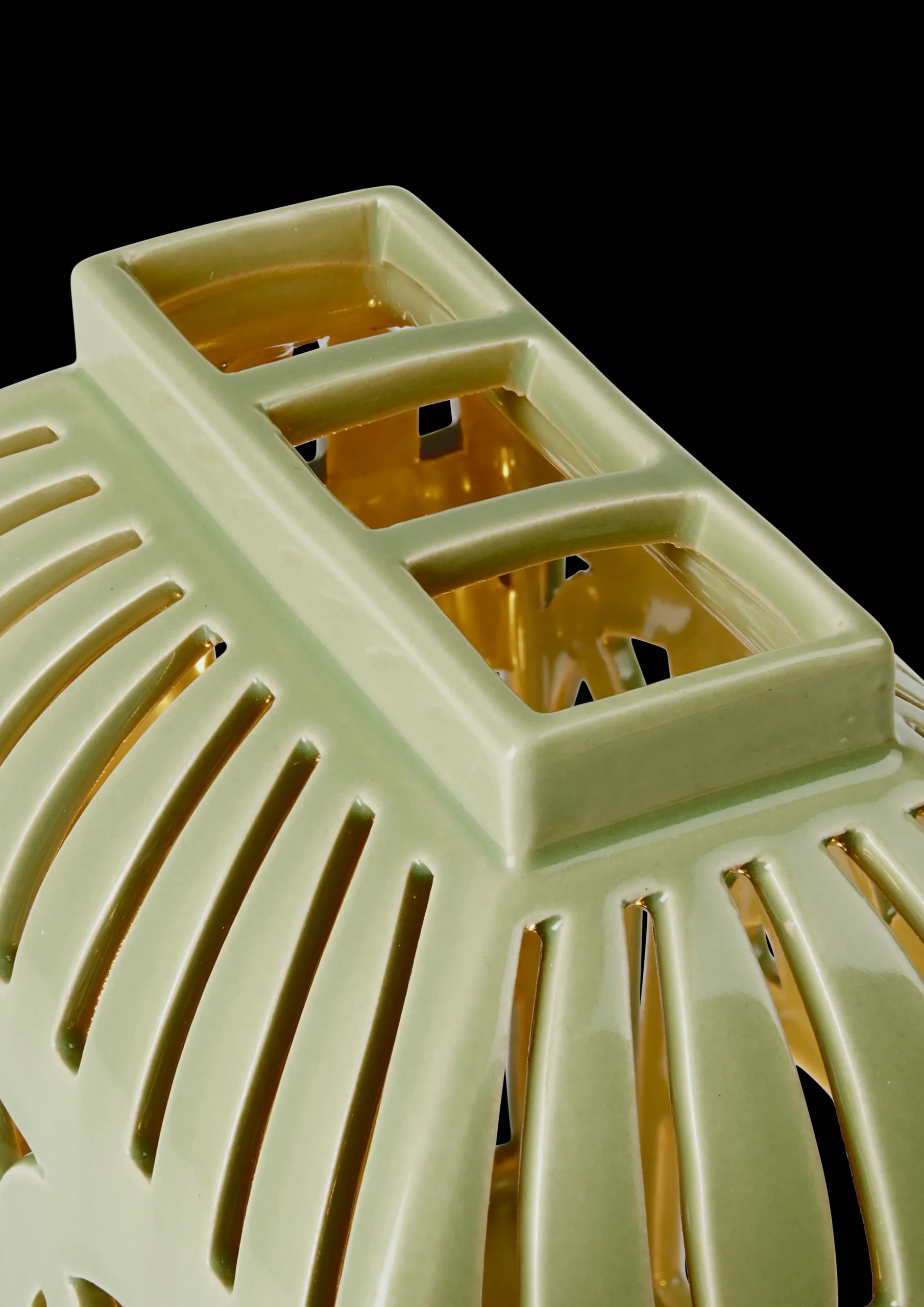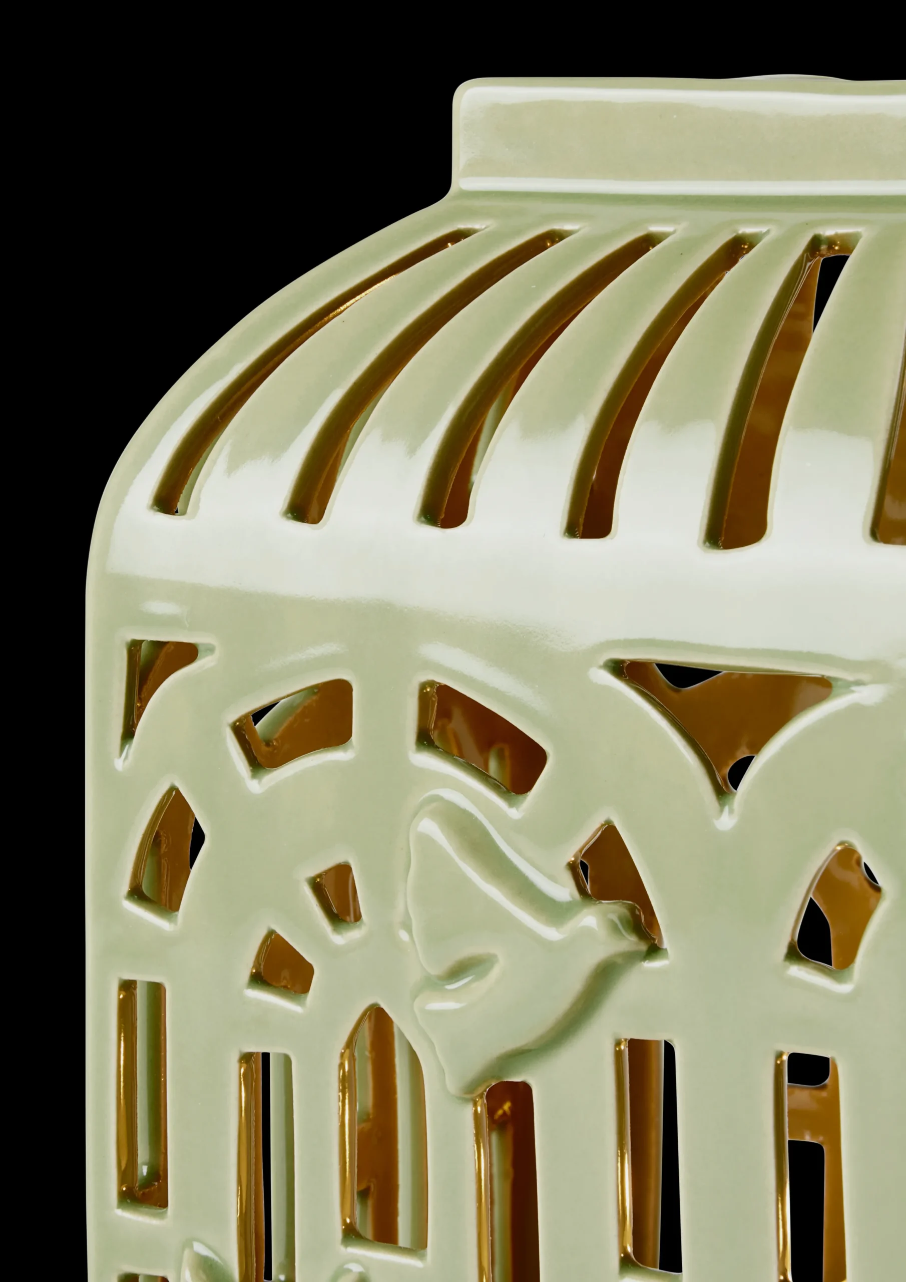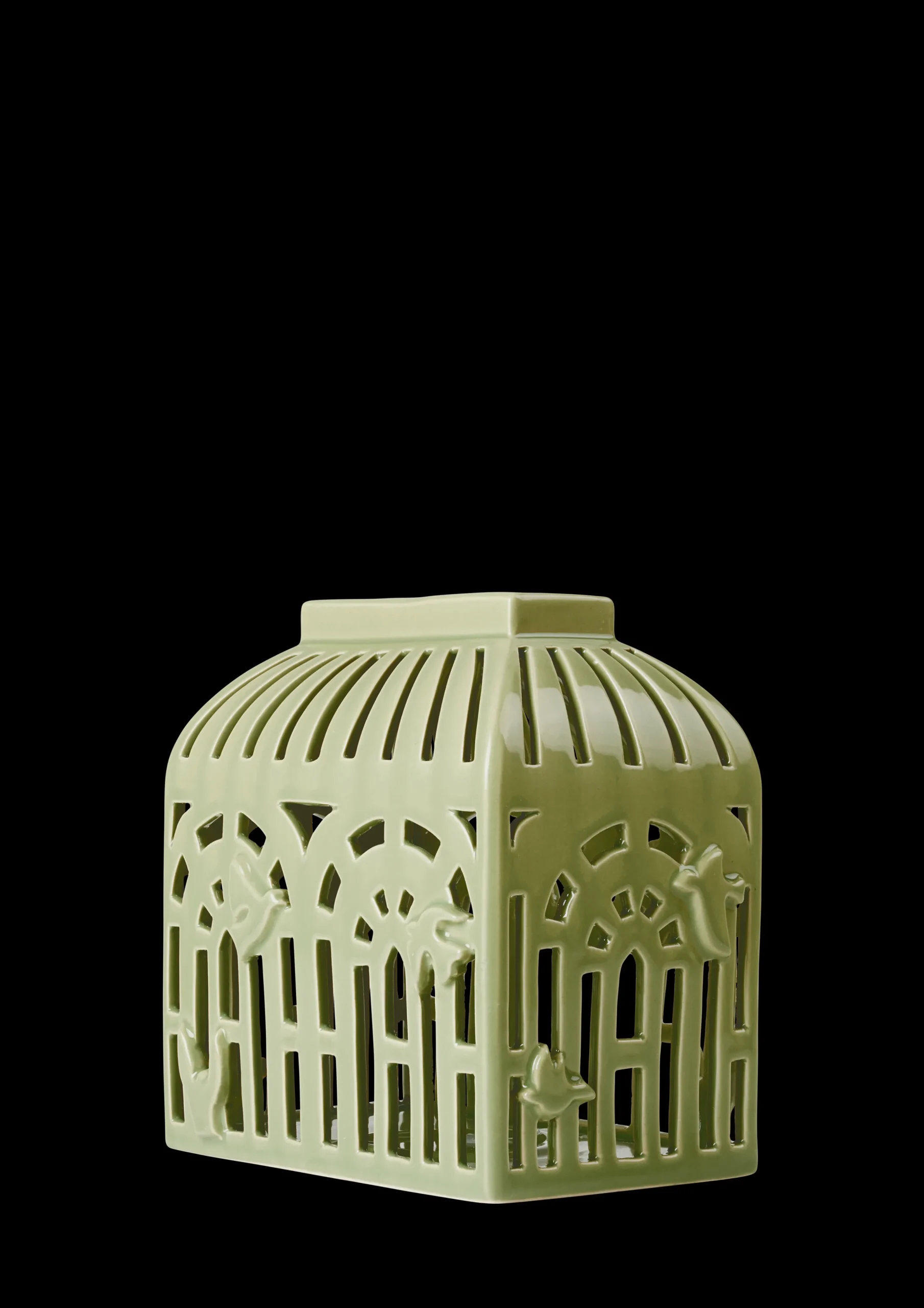 Det delikate lyshuset Orangeri på 16 cm, er laget av keramikk og er glasert i den elegante og naturlige Spring Leaf-grønnfargen. Formet som et gammeldags, romantisk orangeri, kan du tydelig føle arkitekturen, atmosfæren og teksturen. De mange små rutene som utgjør et orangeri er gjengitt som utstansede dekorasjoner i klassiske former. Telysenes glød strømmer gjennom vinduene og skaper en varm og koselig atmosfære. Hvert eneste lille snitt er laget for hånd, akkurat som de stiliserte fuglene i forskjellige former som pryder utsiden. Vakkert keramikkhåndverk fra Kähler på sitt beste.