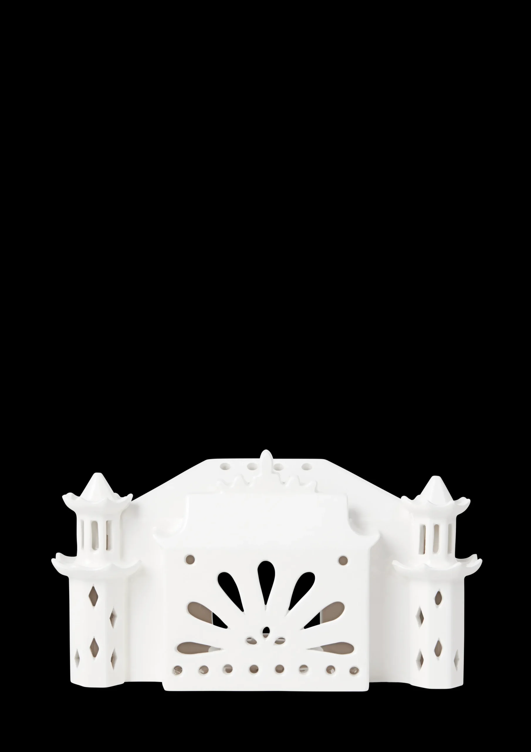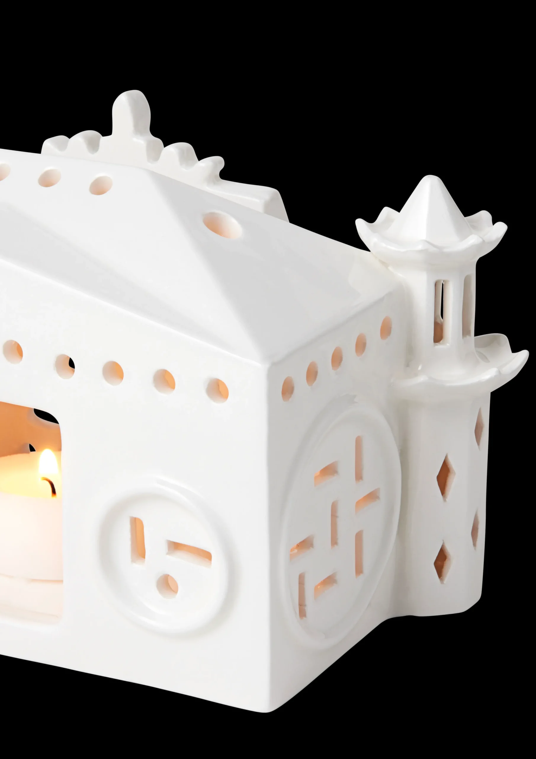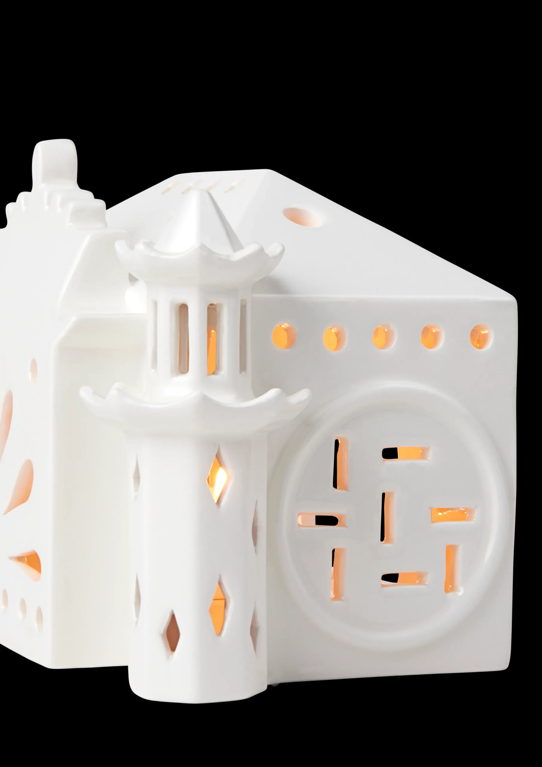 Nyt et ekte Tivoli-landemerke tolket i blankglasert keramikk gjennom Kählers håndlagde designtradisjoner. Pantomimeteateret ble bygget i 1874 av arkitektene Ove Petersen og Vilhelm Dahlerup, og er i dag et populært samlingspunkt i sommerhalvåret. Her presenteres pantomimer og ballettforestillinger gratis for gjestene på Tivoli. Det er et sted der pantomimekunsten lever videre og fortsetter å utvikle seg, og der alle kan dele gleden ved eventyr sammen – et stykke dansk kulturhistorie. Den historiske bygningen er nå udødeliggjort som et av de ikoniske lyshusene i Kählers populære Urbania-serie designet av Mette Bache og Barbara Bendix Becker. Lyshuset er 10 cm høyt og hvert vindu er skåret ut for hånd. De glitrende strålene fra telyset reflekteres i Urbania-lyshusets kritthvite keramikk og skaper en stilfull og koselig silhuett. Rundt det dannes det lekne klynger av lys og skygge.