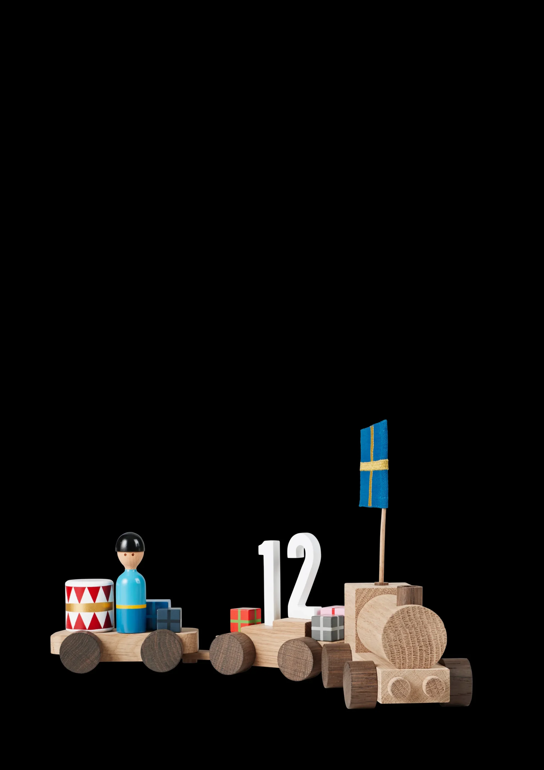 Dette flotte bursdagstoget er inspirert av et originalt Kay Bojesen-tog og er designet for å brukes som et dekorativt element på bursdager. Det er også flott som pynt på hyllen, der du kan nyte Kay Bojesens originale fortellinger laget av tre hver dag. De tre vognene er dekorert med flagg, fargerike gaver, tall, den lille gardisten og en tromme – alle festlige elementer fra Kay Bojesens kreasjoner. Kay Bojesen bursdagstog kommer med tall fra 0 til 9 (med to ett-tall), som i likhet med flagget kan settes inn i hullene i vognene så du kan skape din egen kombinasjon. ADVARSLER: Ikke egnet for barn under 3 år. Fjern all emballasje før bruk. Bursdagstoget er IKKE en leke og kan KUN brukes til dekorasjon. Ikke forlat bursdagstoget uten tilsyn.