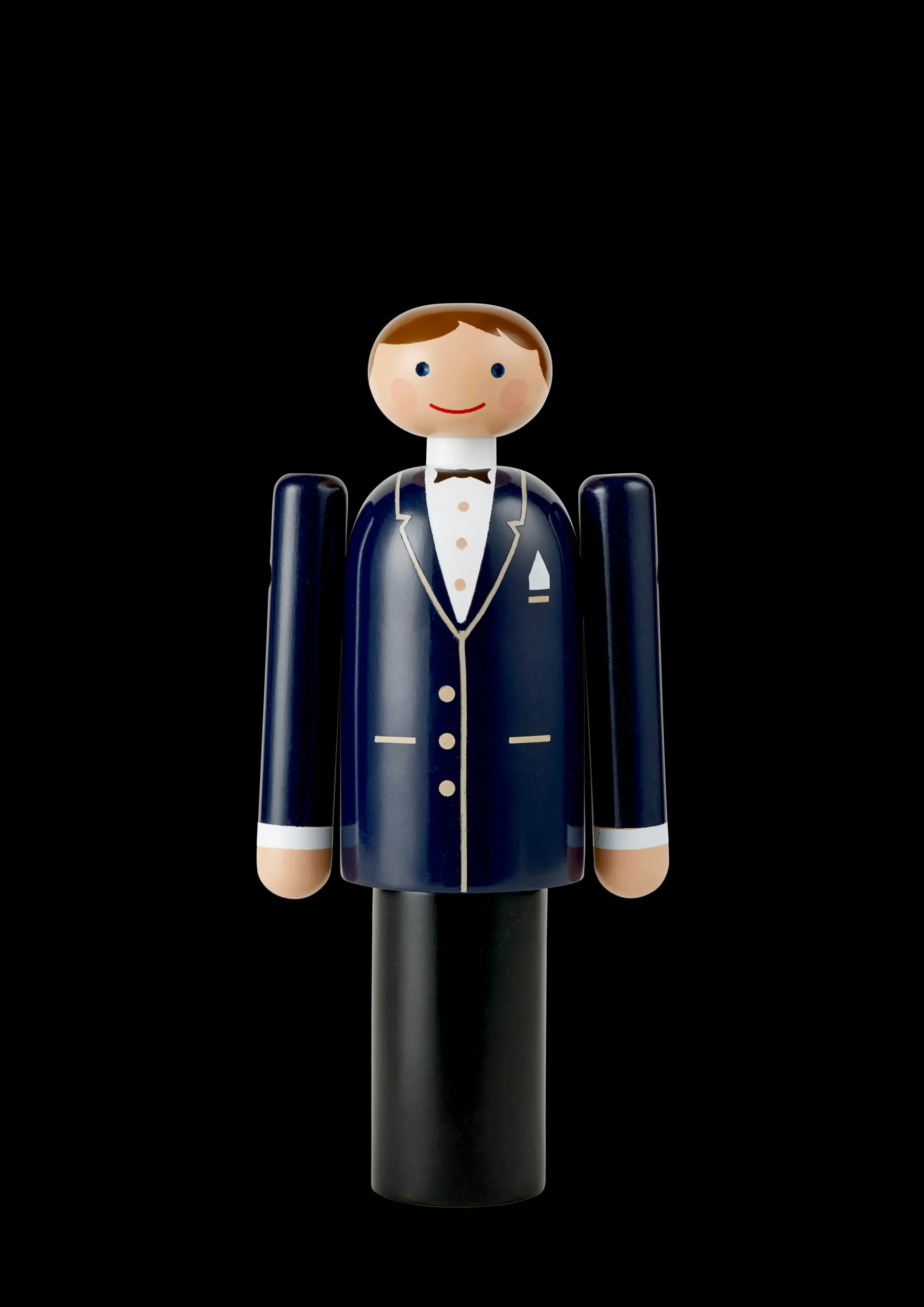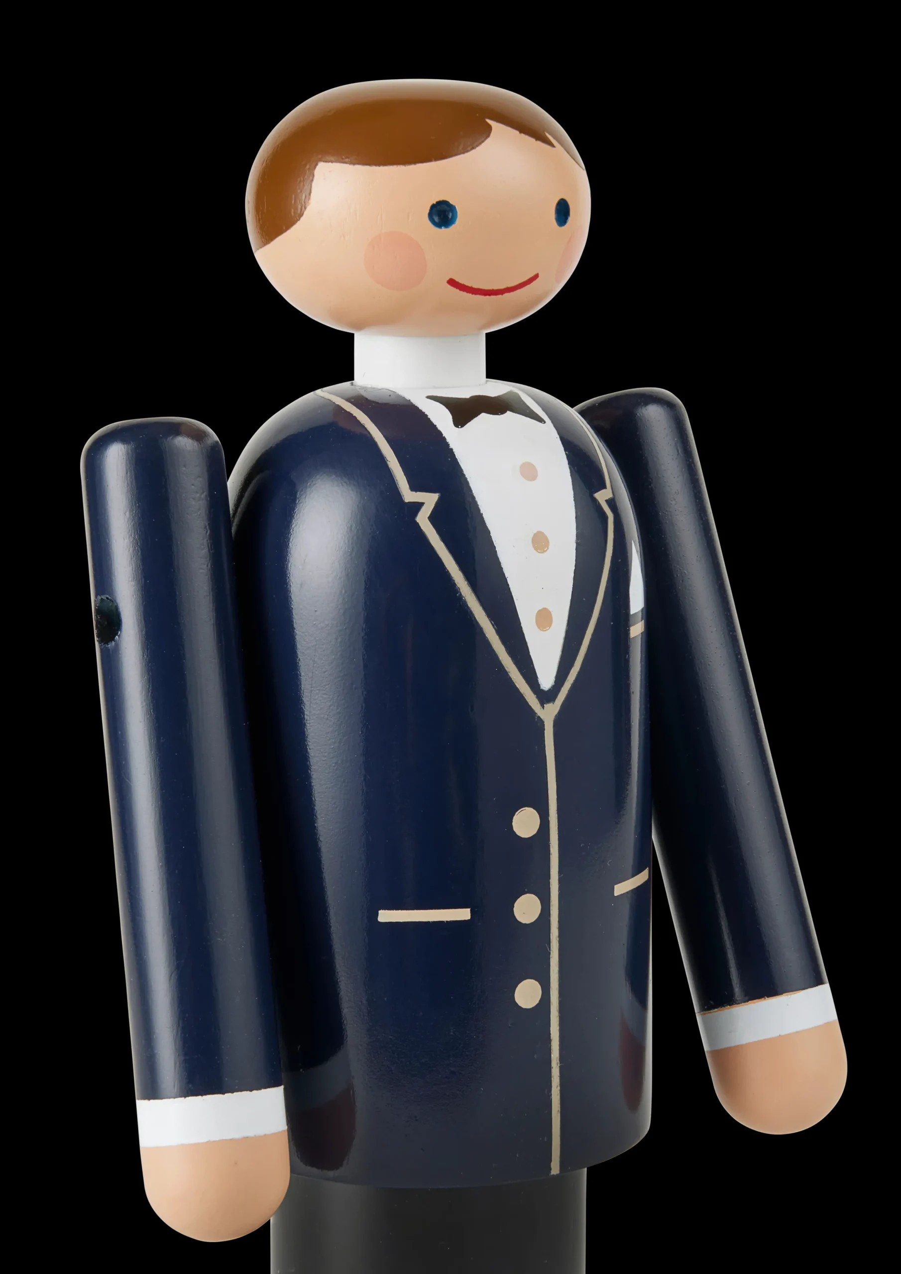 Kay Bojesens Groom er originalt og klassisk dansk trehåndverk på sitt beste – designet i Bojesens ikoniske runde former med et velkjent glimt i øyet. Groom måler 18 cm og er elegant kledd i en mørk dress med hvit skjorte og svart sløyfe. Omhyggelige detaljer som knapper, lommetørkle og slag gjør jakken levende, og brudgommens glade og imøtekommende smil gir ham sjarm og personlighet. Formen på brudgommen er basert på de originale figurene fra arkivene, som er enkle og minimalistiske, men fulle av hjerte og sjel. Figuren er laget av FSC-sertifisert bøk og laget i samme høye kvalitet som Kay Bojesens trefigurer er kjent for. Gi Groom som gave på det kommende utdrikningslaget, eller la den elegante figuren finne veien til gavebordet sammen med Grooms utvalgte partner.