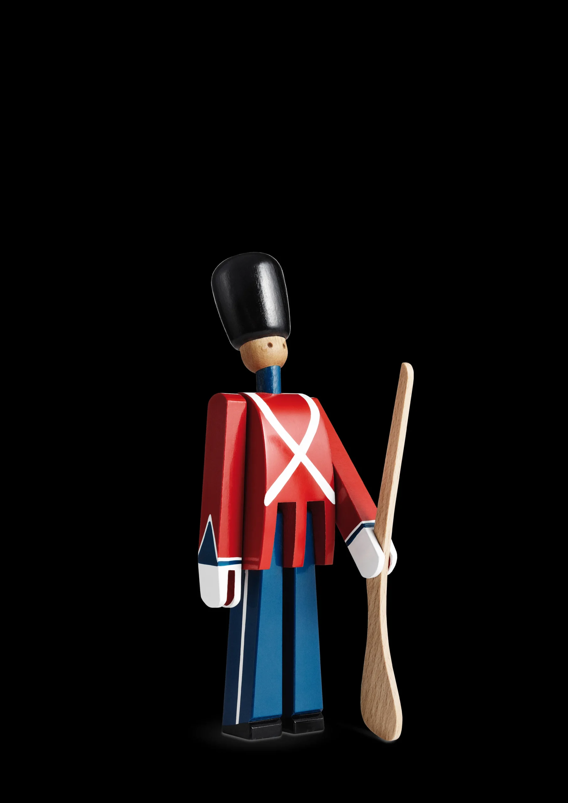 Inspirert av et av Danmarks nasjonalsymboler fra Amalienborg Slotsplads skapte Kay Bojesen i 1942 sine håndmalte gardister. Helt siden har Trommeslageren, Fanebæreren og den Menige med gevær vært stolte representanter for dansk kvalitetsdesign. En fin gaveide til både barn og voksne. Vær forsiktig når du plasserer geværet. Plasser geværet forsiktig i gardistens hånd. Det er ikke nødvendig å skyve geværet helt inn – kun til det sitter godt fast.