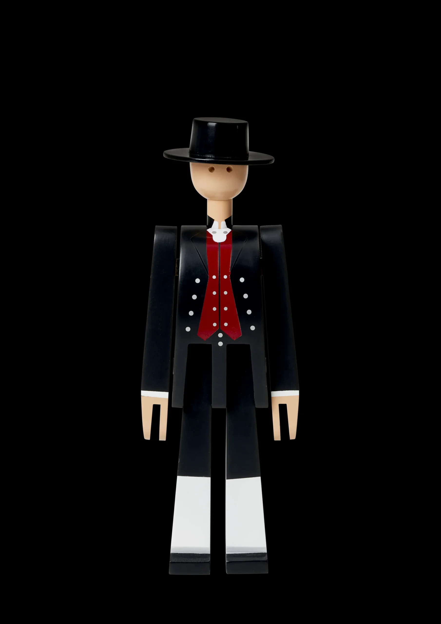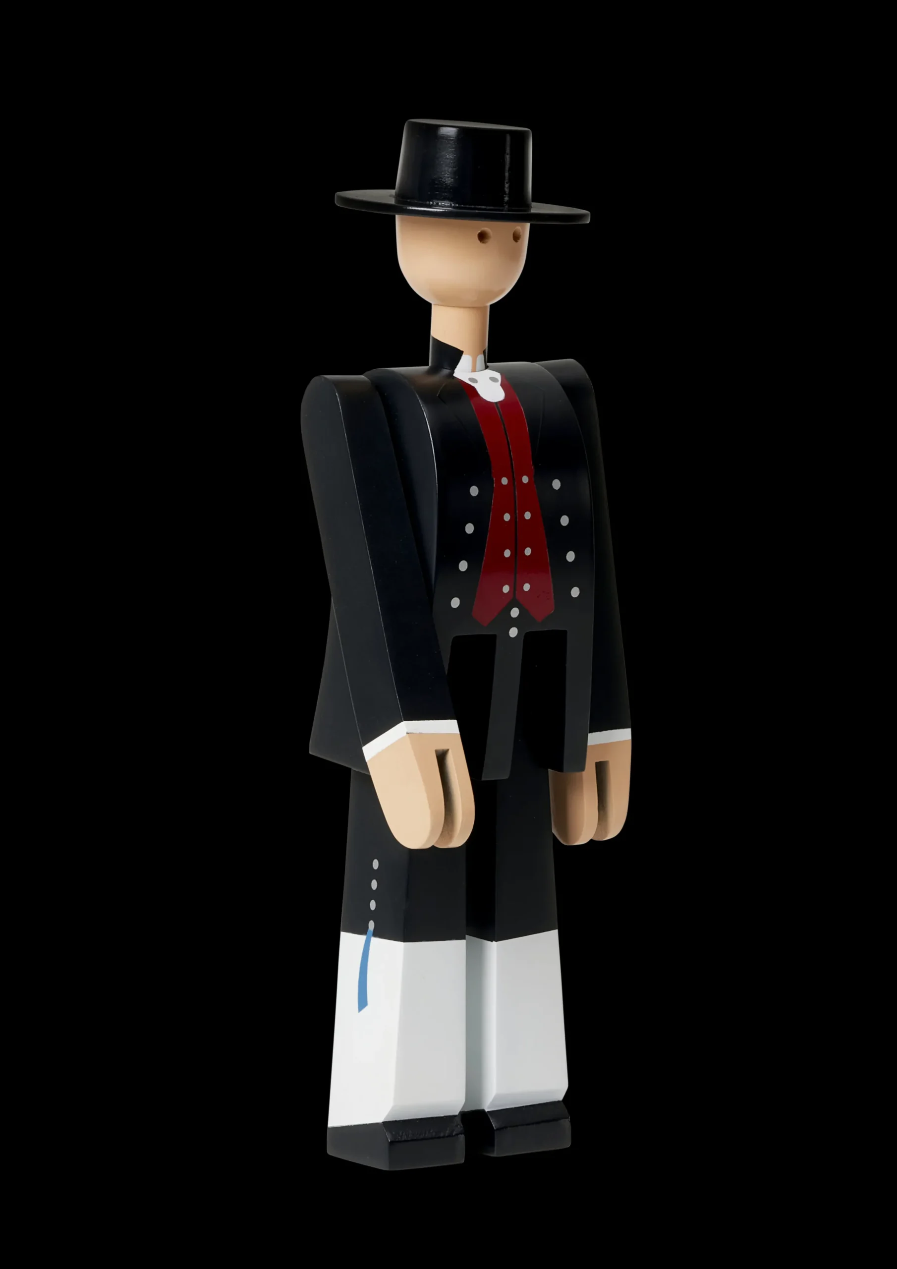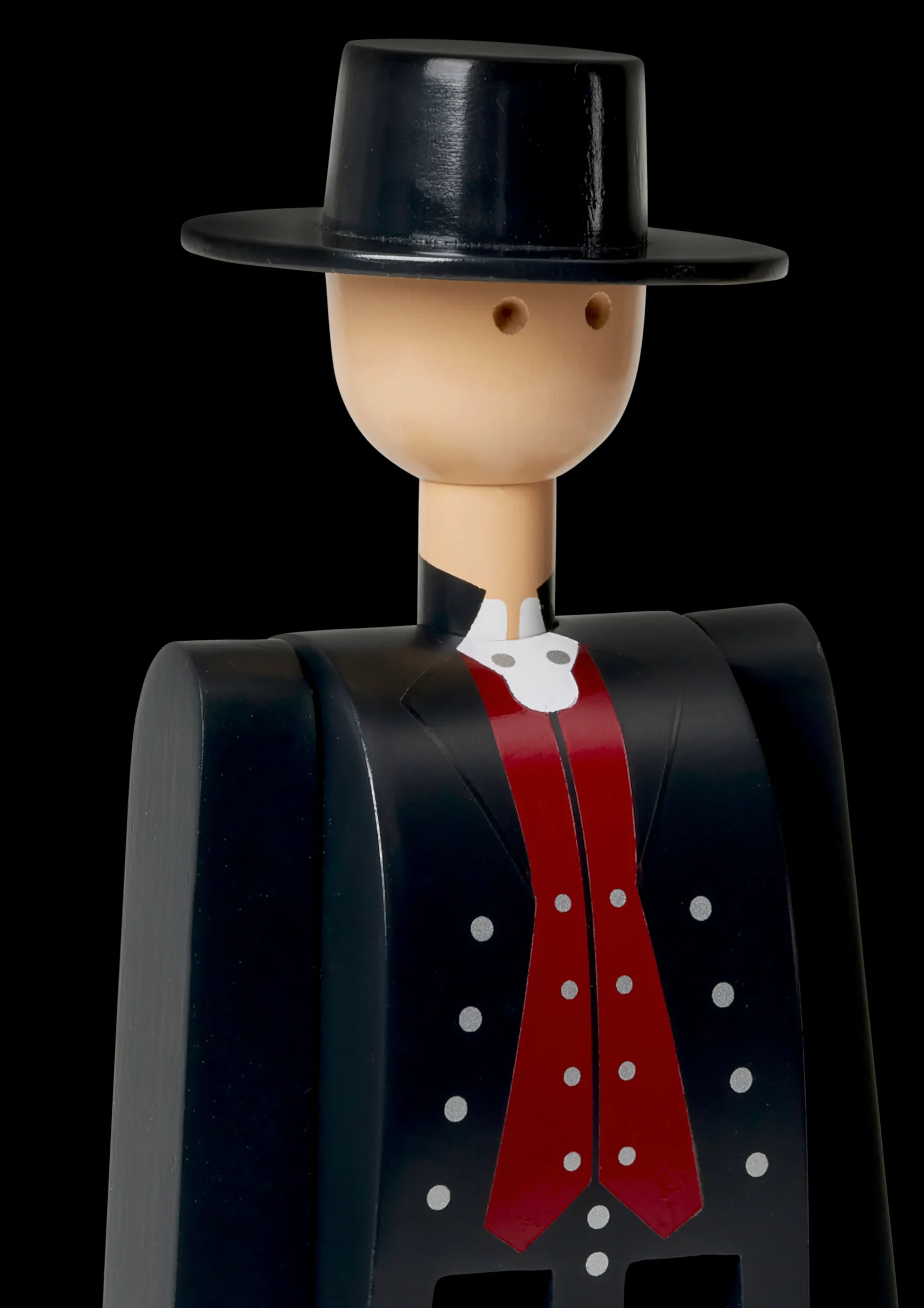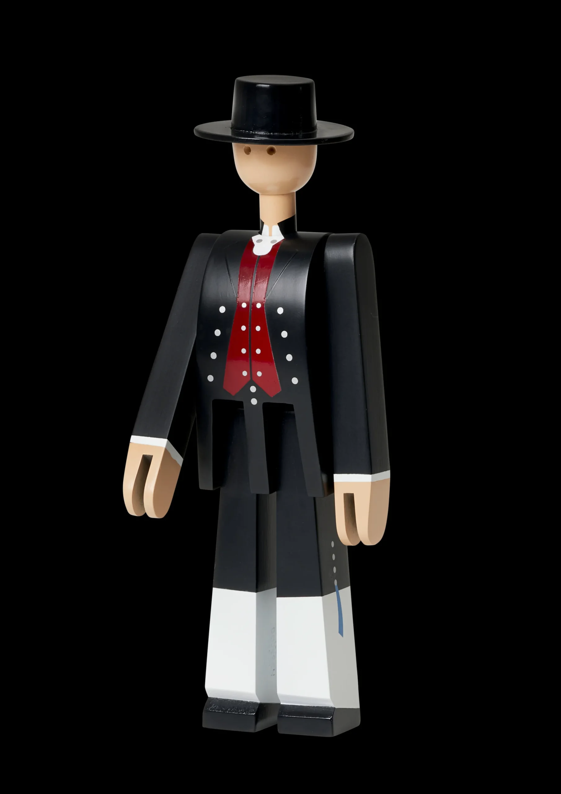 17. mai er en gledens dag med feiringer over hele Norge, og med sine smilende linjer er Kay Bojesens Bunadsfigurer perfekte å sette på bordet på nasjonaldagen – eller ved andre festlige anledninger med venner og familie. Mannen er basert på Kay Bojesens berømte Gardist og har fått en nydesignet hatt. Han står rank og staut i svarte bukser, svart jakke, rød vest og hvit skjorte, og selvfølgelig med de tradisjonelle knehøye strømpene. Bunad-mannen måler 20,5 cm, er laget av FSC-sertifisert bøk og er laget i det høykvalitets håndverket som er typisk for alle Kay Bojesens trefigurer.