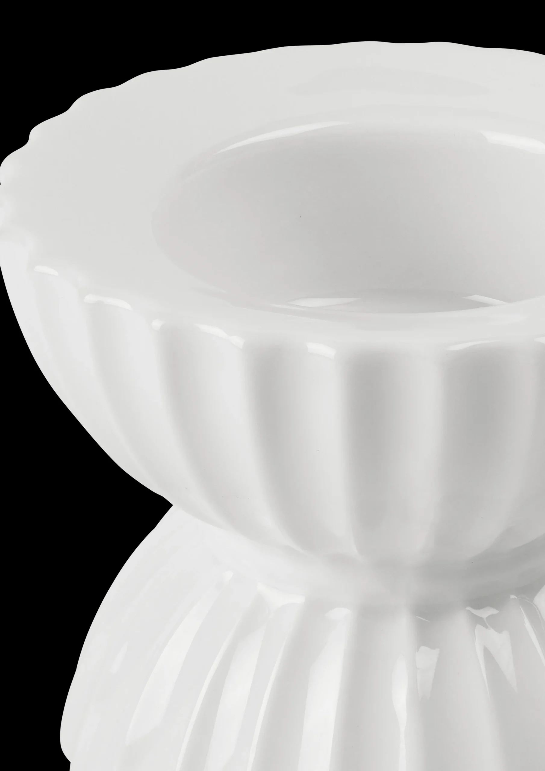 Elegante former, kant og mye attitude. Med denne Tura-telysestaken får du enkel, stilren og dekorativ skulpturell kunst som vi kjenner den fra Lyngby Porcelæn, der arkivdesign, klassiske former, mønstre og ren estetikk går opp i en høyere enhet. Telysholderen er 7 cm høy og er designet for å trekke lyset nesten inn i den øverste halvkule. De ikoniske rillene fra Lyngby følger lysestakens karakteristiske former og skaper et moderne uttrykk i kontrasten mellom det stramme og det myke. Og detaljen med halvkulene som møtes i et smalt bånd, gir også telyseholderen en letthet som passer perfekt inn i et moderne interiør. Med sin voluminøse design og personlighet vil telysholderen Tura garantert stjele all oppmerksomheten i rommet og er nesten en skulptur i seg selv.