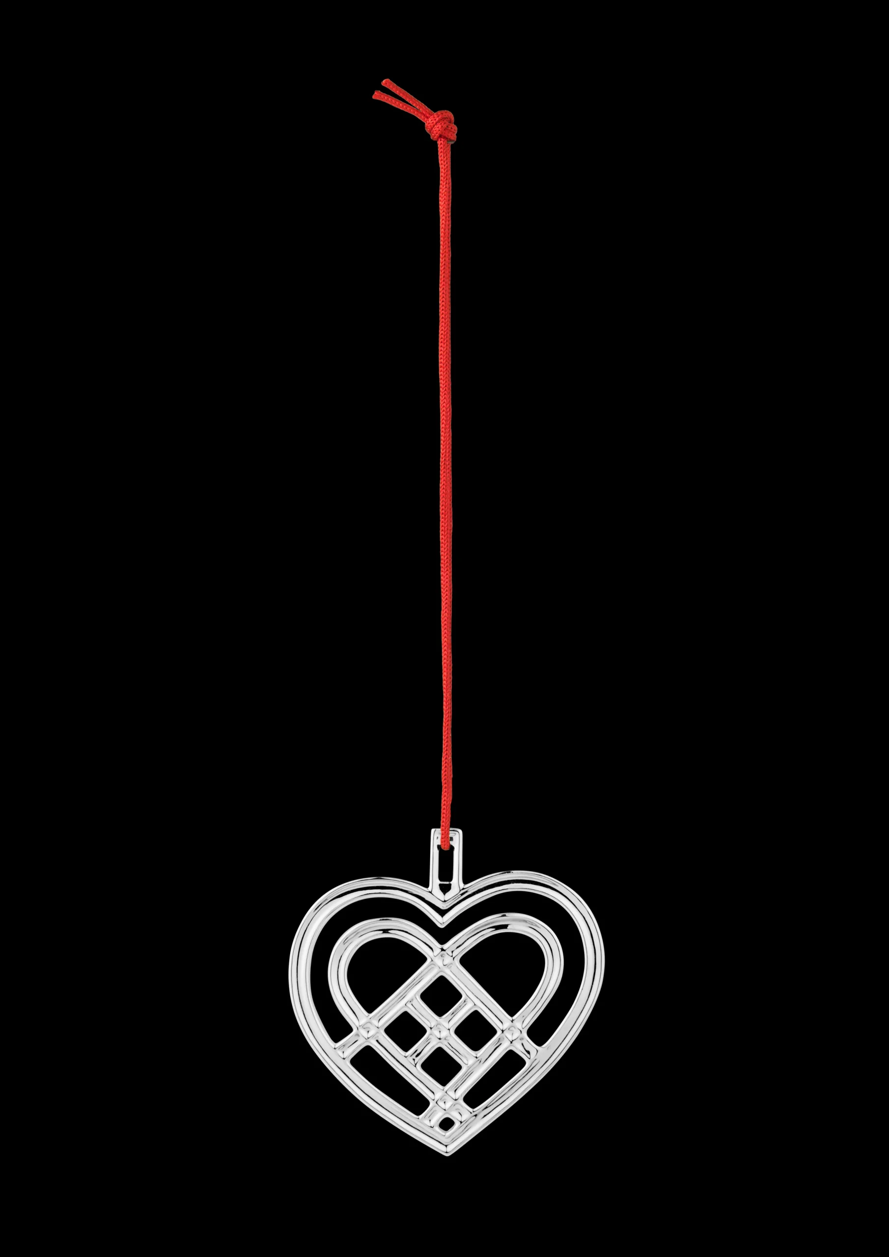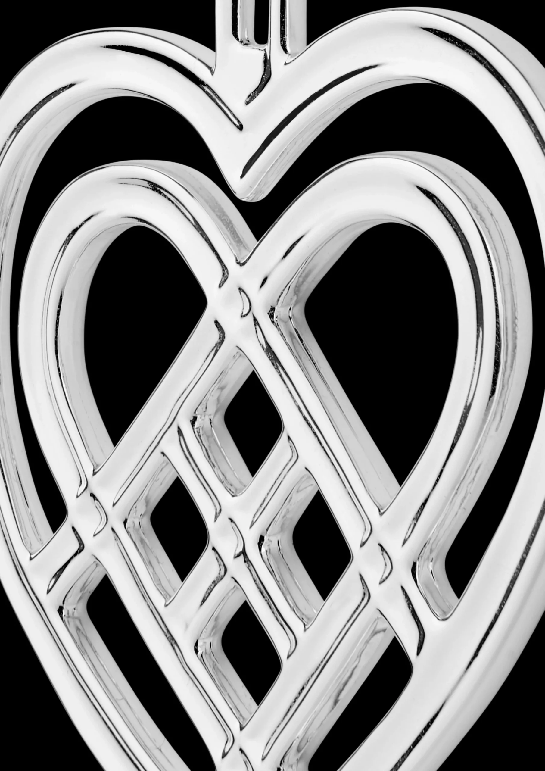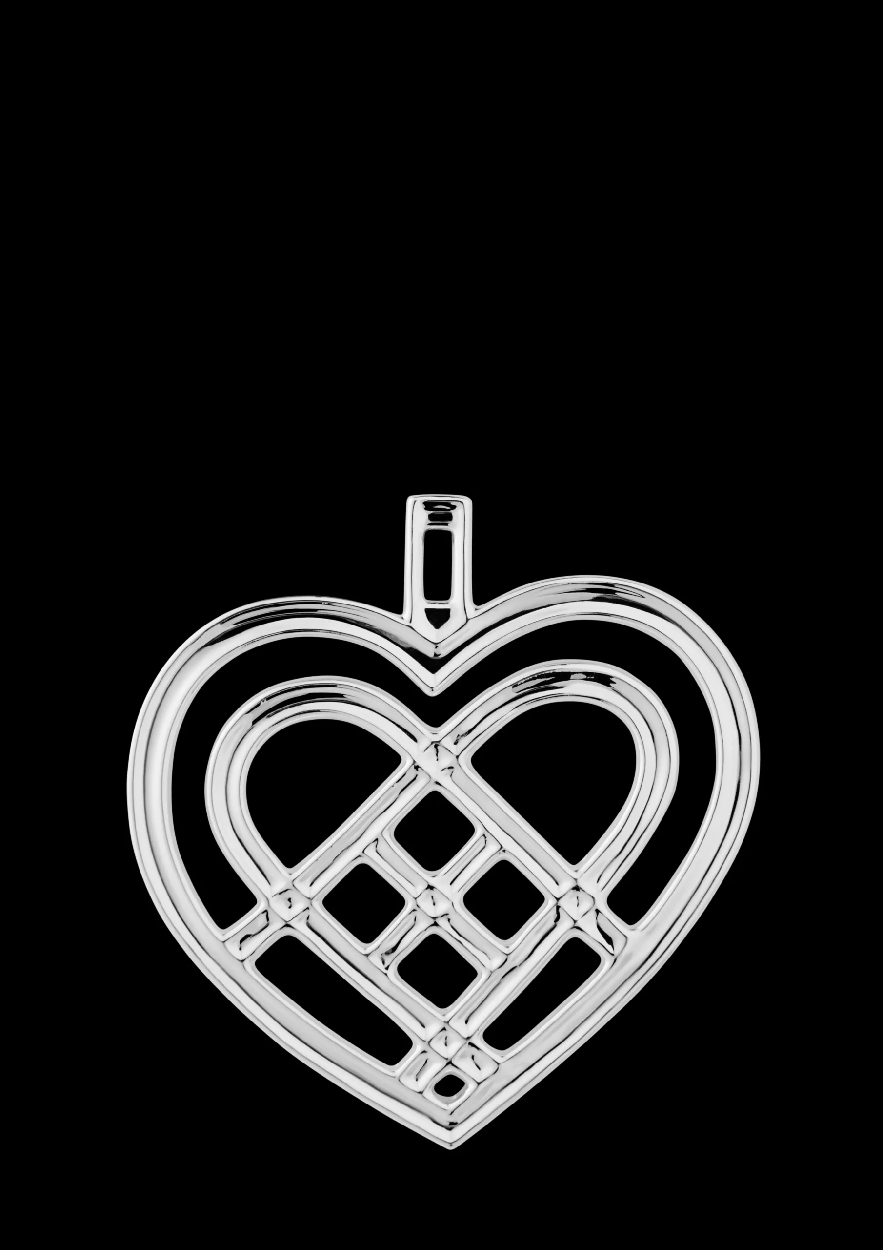 Klassisk julepynt med kunstnerisk preg. Rosendahls Karen Blixens jul er for mange selve symbolet på den hyggelige og tradisjonelle julen – full av historie og julesymbolikk som får julegleden til å vare helt frem til julaften. Ole Kortzau laget sin første Karen Blixen-julepynt i 2007. Hvert år kommer det ny hengepynt i den unike håndlagde kvaliteten, laget med en grad av presisjon og et øye for detaljer som får hver enkelt hengepynt til å fremstå som et lite kunstverk i seg selv, belagt med ekte sølv og gull. 2024-kolleksjonen rommer blant annet det sølvbelagte «flettede julehjertet», som smelter sammen med og omkranses av et større hjerte – et symbol på kjærlighet og samvær i juletiden. I likhet med de andre små hengepyntene i serien er den ca. 7 cm høy og fungerer perfekt som vindusdekorasjon. Motivene i Karen Blixens Jul er ofte en kjærlighetserklæring til barnas perspektiv på julen. Men selv om Ole Kortzaus julehistorier tar utgangspunkt i virkeligheten, så er de ikke virkeligheten. Derfor er motivene også alltid litt forskjøvet. De er alltid litt skjeve, litt underfundige. Ole Kortzau vil at vi skal stoppe opp og ta en pause – og oppdage alle de klassiske figurene på en annen måte. Da vil nemlig et trent øye legge merke til de to hjertene i dobbelthjertet, som med designerens egne ord er «fullstendig vindskjeve». Denne julepynten leveres med én fin rød snor.