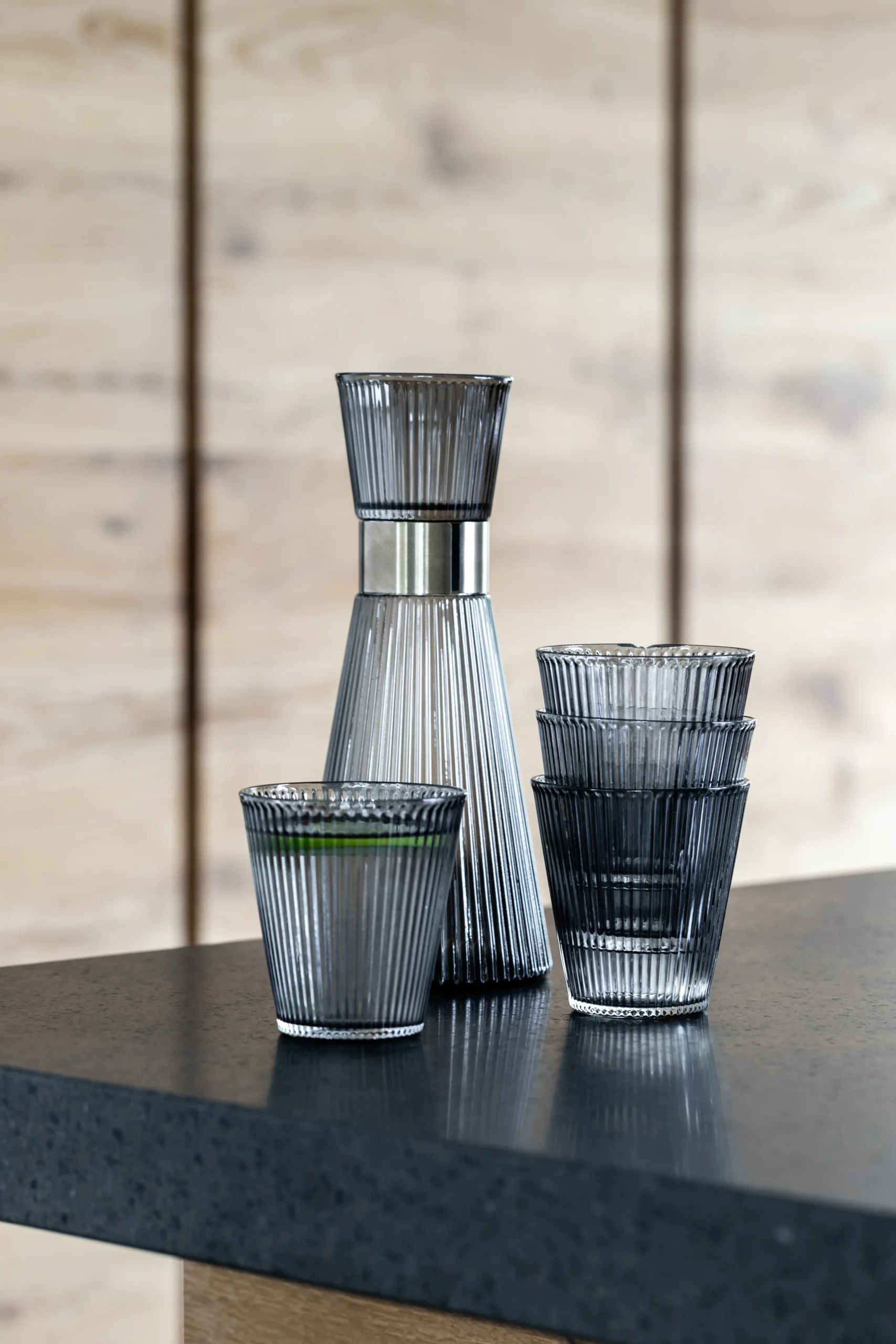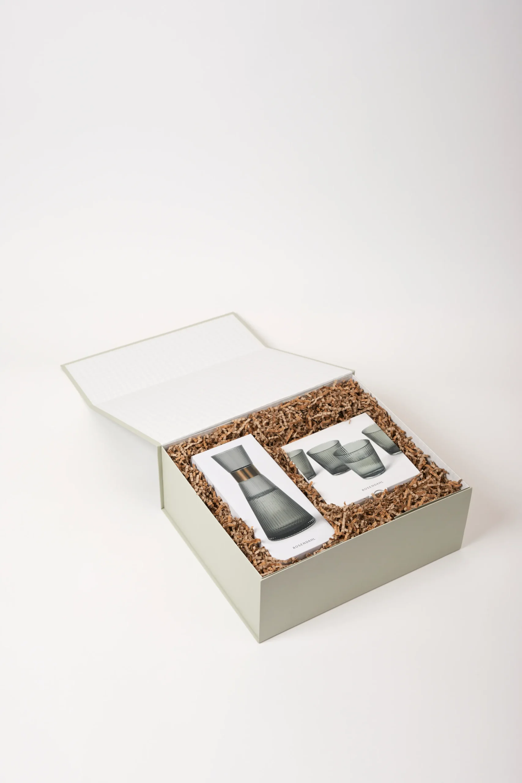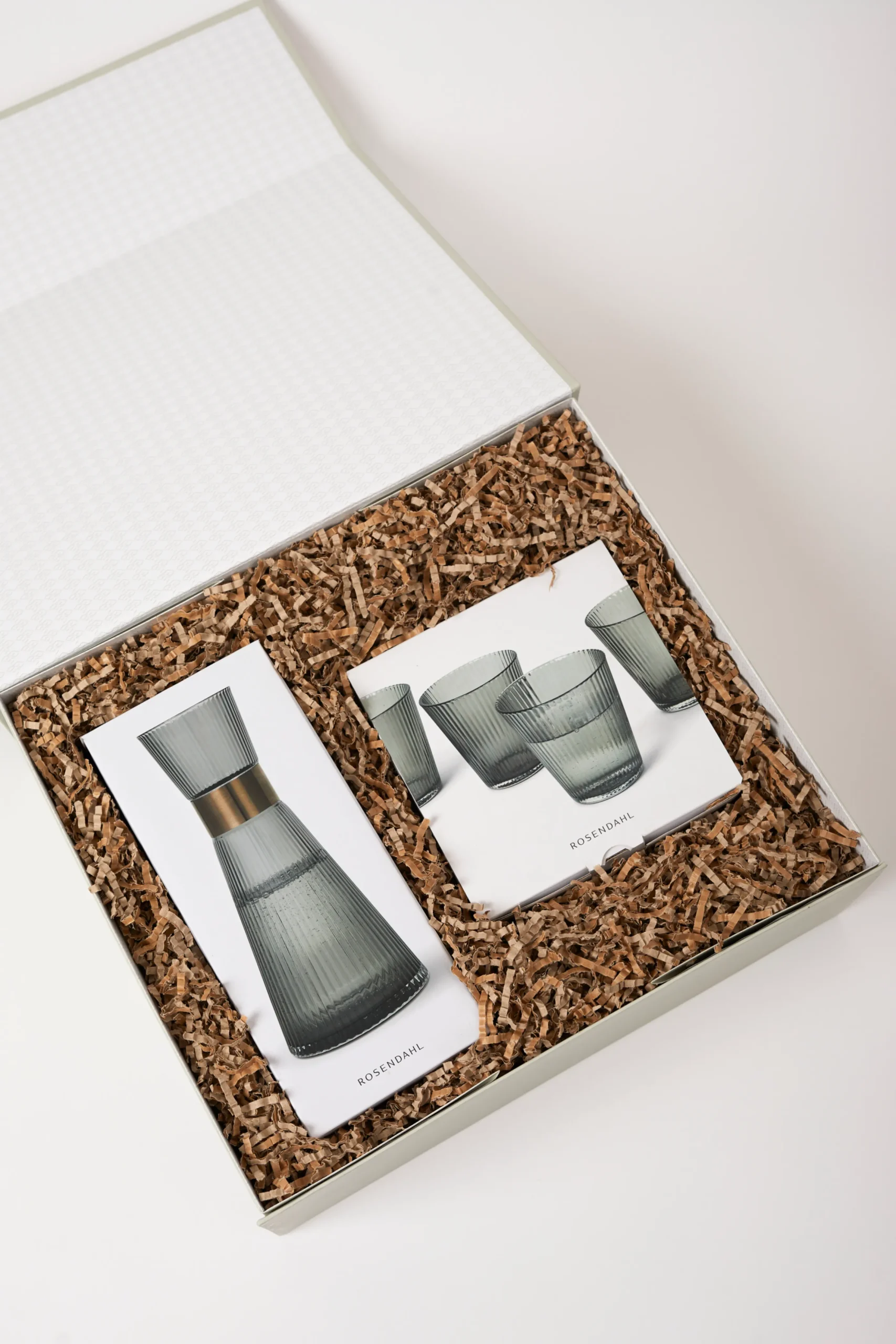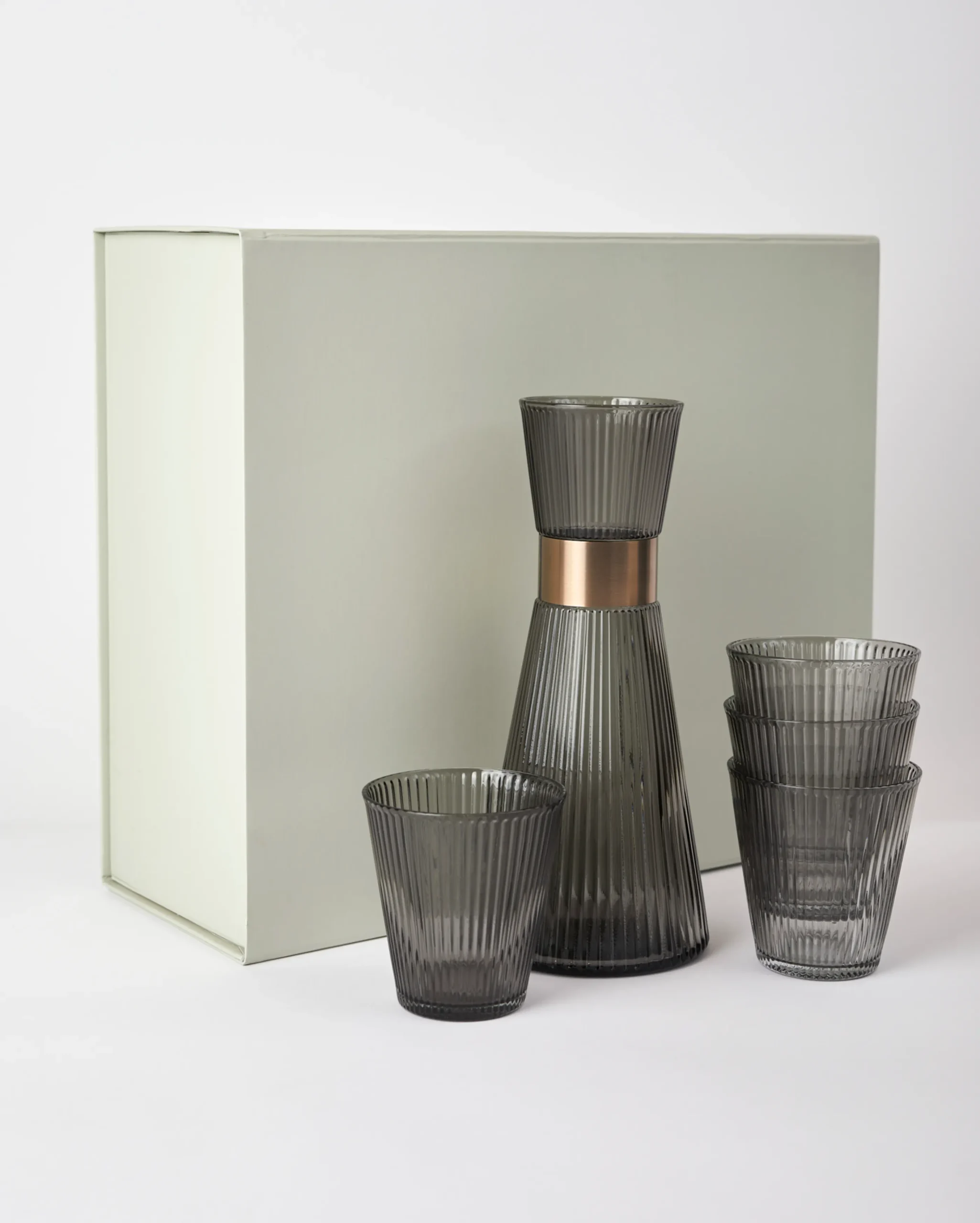 Munnblåst glass, en elegant røykfarge, et patinert stålbånd og minimalistiske riller. Den perfekte gaven til deg selv eller en du er glad i. I denne giftbox fra Rosendahl finner du funksjonell glassdesign for det moderne livet. Den munnblåste karaffelen har et lett vektløst utseende, men det røkte glasset og det patinerte stålbåndet bidrar også til å skape et unikt og stilig utseende. Glassene er designet for å passe perfekt ned i toppen på karaffelen slik at glass og karaffel kan bæres med én hånd. Giftboxen inneholder 1 Grand Cru Nouveau vannkaraffel 1l og 4 Grand Cru Nouveau vannglass 26 cl. Giftboxen har en total verdi på 798 kr.